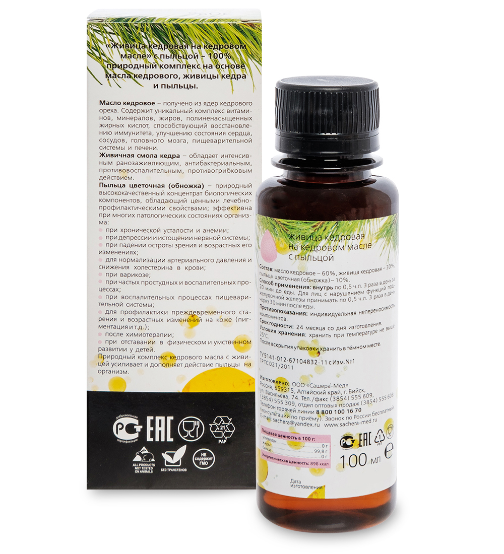 Med-09/17 живица кедровая на кедровом масле с пыльцой, 100 мл. Параметры товара Страна производства: Россия Размеры упаковки Длина: 5 см; Ширина: 4 см; Высота: 14 см; Вес: 0.14 кг.
