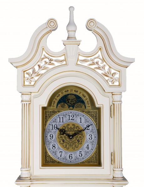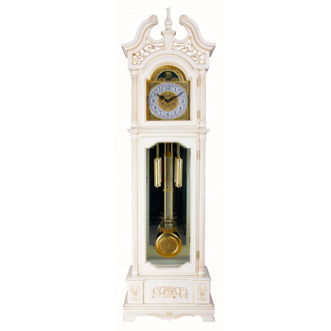 Механические напольные часы 8608 ivory gold. Механические напольные часы Dinastiya 8608 Ivory Gold Механические напольные часы Dinastiya 8608 Ivory Gold в цвете Слоновая кость с золотой патиной имеют надежный механизм. Элементы фасада корпуса изготовлены из отборных пород твердого дерева. Маятник и гири золотистого цвета. Корпус тонирован в теплый цвет слоновой кости с золотым патинированием, который позволит этим часам стать неотъемлемой частью интерьеров, решенных в различных стилях и цветовых гаммах. Зеркальная задняя стенка Великолепный фронтон в виде «медвежьих лап» (в виде короны) увенчан резным навершием. Небольшой тонкий «карниз» отделает верхнюю люцерну, которую, как и застекленную дверцу, обрамляют лаконичные резные пилястры с каннелюрами. На золоченый циферблат из полированной латуни нанесены арабские цифры. На центральном диске взгляд приковывает ажурный высеченный узор из латуни. Гири и маятник золотого цвета отделаны тисненым орнаментом на основе растительных мотивов, повторяющим узор циферблата, над которым располагается имитация лунного календаря. Описание напольных часов Dinastiya 8608 Ivory Gold с патиной: - Тонирование корпуса выполнено в цвете - слоновая кость с патиной. -Механизм пружинный с ручным заводом, бой на каждые полчаса и час, ручное отключение боя.- - Вес-25 кг. - Зеркальная задняя стенка - Размер: 205х57х26 см - Размер коробки: 209*61*32 см