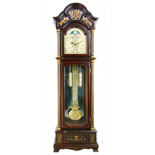 Напольные механические часы dinastiya 8609-r gold. Напольные механические часы Dinastiya 8609-R Gold Напольные механические часы Dinastiya 8609-R Gold цвета темный орех с золотой патиной и зеркальной задней стенкой имеют надежный механизм и качественный корпус из твердой липы, покрытый рояльным лаком, сохраняющим долговечность на долгие годы. Механизм механический с цепным подвесом гирь, пружинный завод 31 день. Часовой по количеству часов и получасовой бой 1 раз. Ручное отключение боя. Зеркальная задняя стенка. Циферблат чеканный с арабскими цифрами, фигурные стрелки, маятник в виде лиры. Маятник и гири металлические, золотистого цвета. Фронтон резной. Ручная резьба по дереву. Имитация лунного календаря. Характеристики часов Dinastiya 8609-R Gold: Корпус: дерево. Цвет: темный орех с золотой патиной. Размер: 205х57х26 см Упаковка: целиком в месте с тумбой. Размер упаковки: 209*61*32 мм Вес: 24 кг. Вес с упаковкой: 28 кг. Гарантия: 1 год Бой каждые полчаса и час по количеству часов. Завод (ход): 31 день Секундная стрелка: нет. Без мелодии. Размер, см : 205x57x26 Цвет : Темный орех с золотой патиной Материал : Дерево Механизм : Механический Функции : Бой c отключением СКИДКИ : Индивидуальные