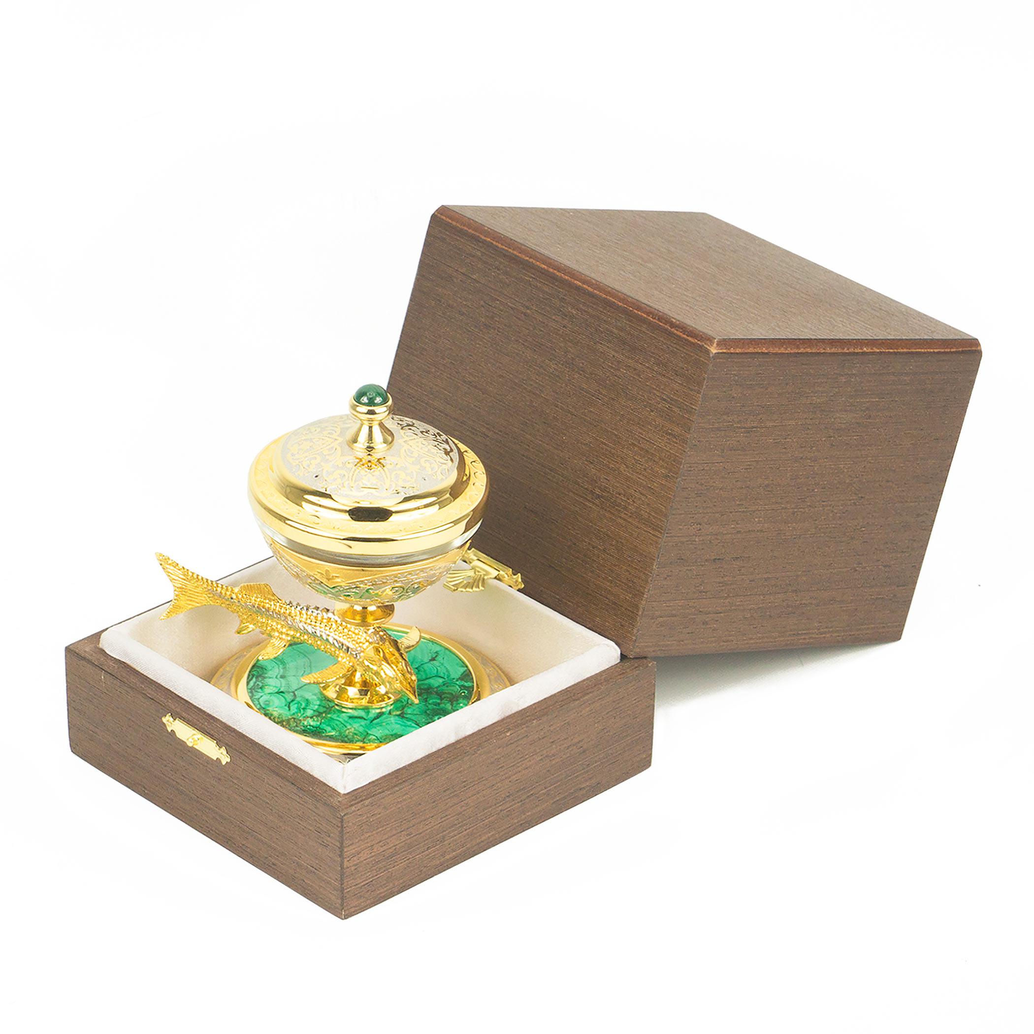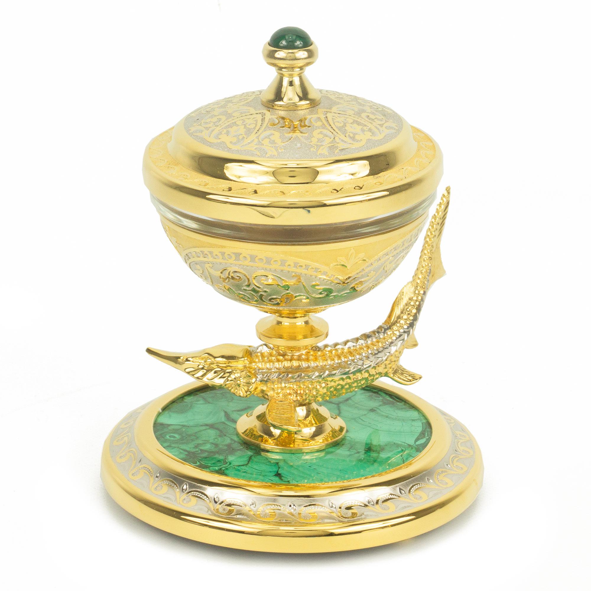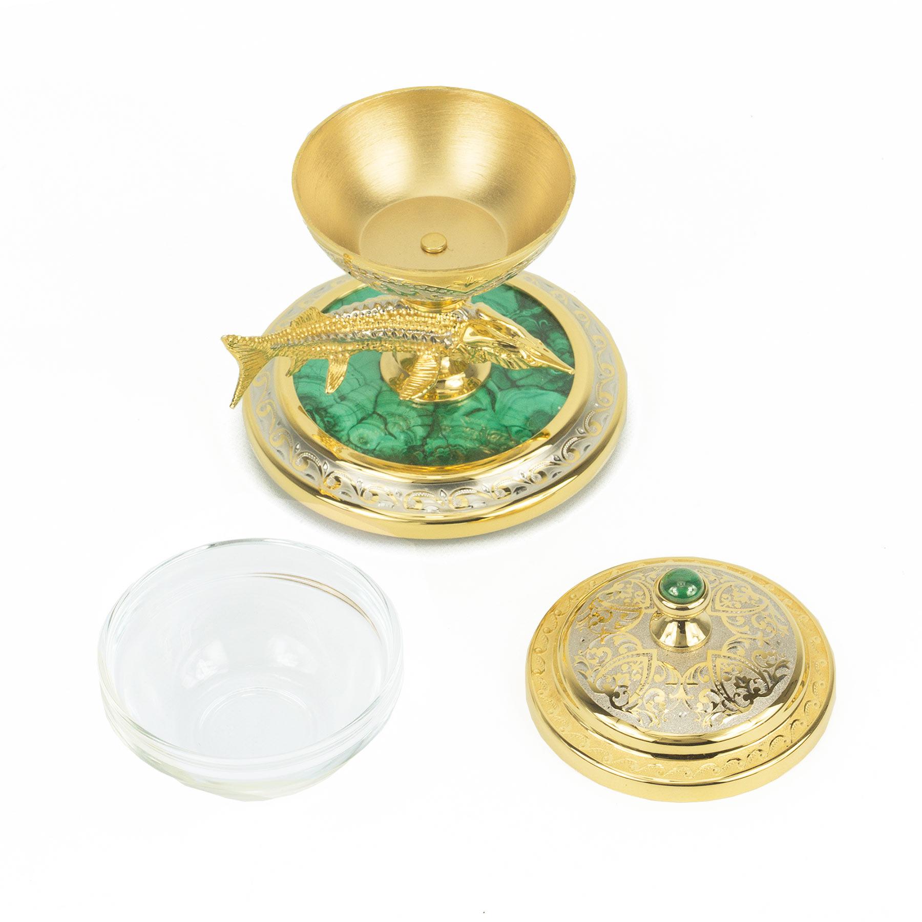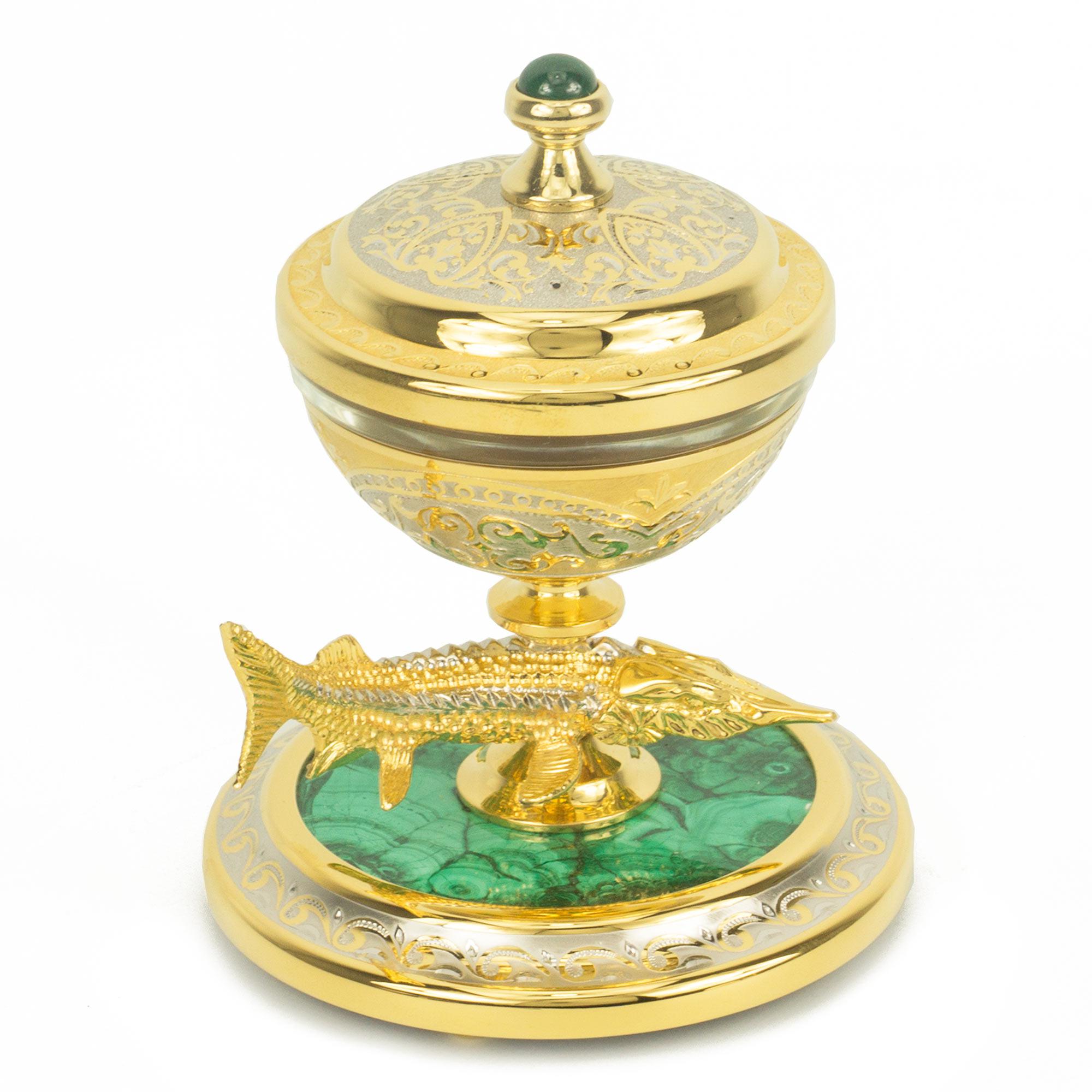 Икорница "стерлядка" малахит позолота 100х100х130 мм 2100 гр.. Вес 2100 г Размер 10х10х13 см Материал малахит, латунь, хрусталь, никель, покрытие золотом (999,9)  развернуть описание ▼
