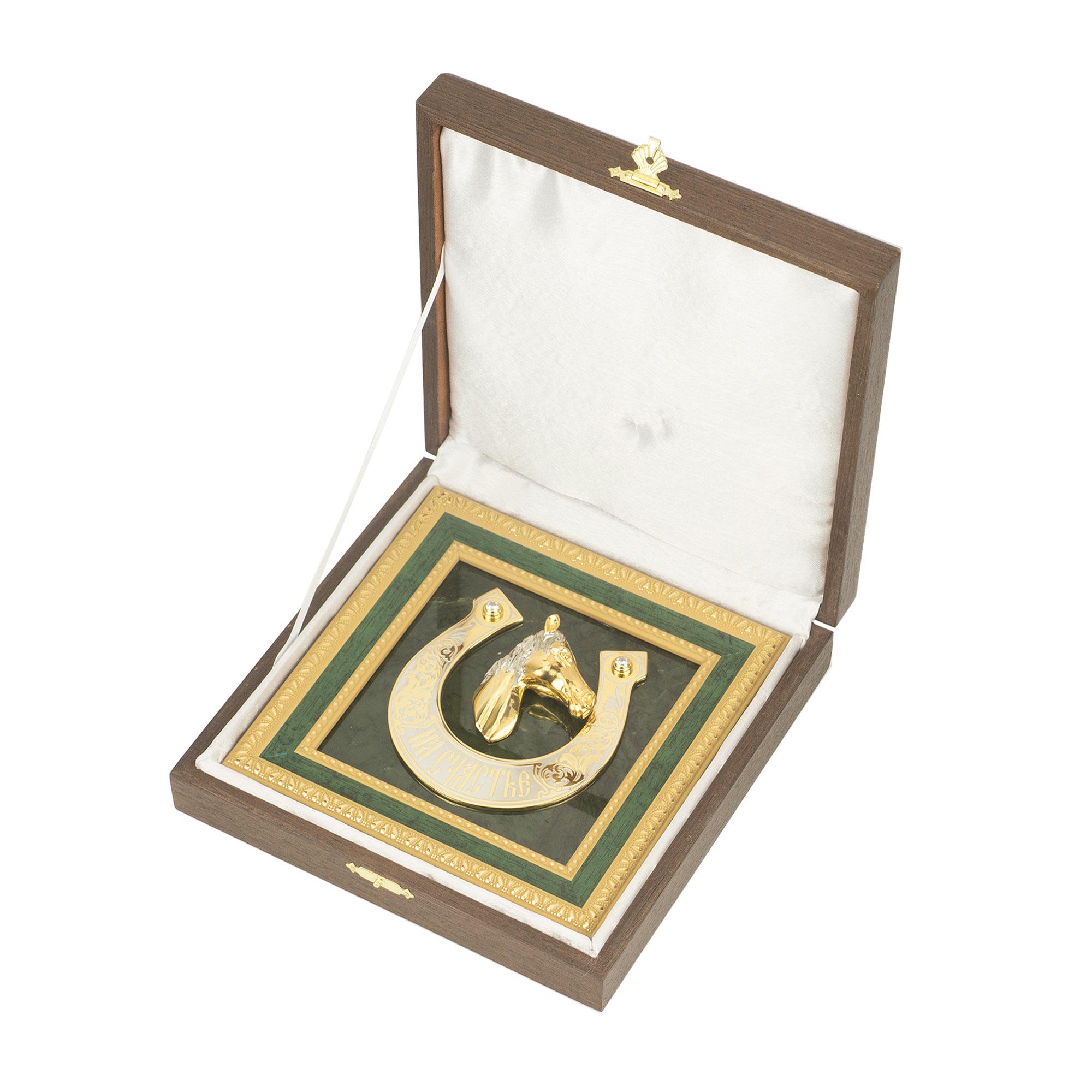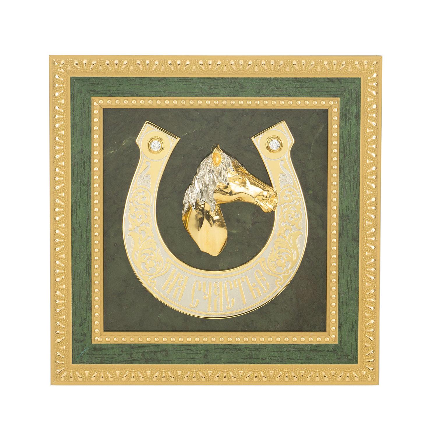 Панно "подкова на счастье" нефрит латунь багет 180х180х25 мм 142. Вес 1420 г Размер 18х18х2,5 см Материал нефрит, фианит, латунь, никель, покрытие золотом (999,9). Месторождение Миасское, Челябинская область, Россия  развернуть описание ▼