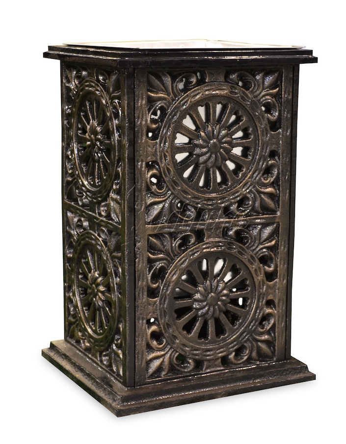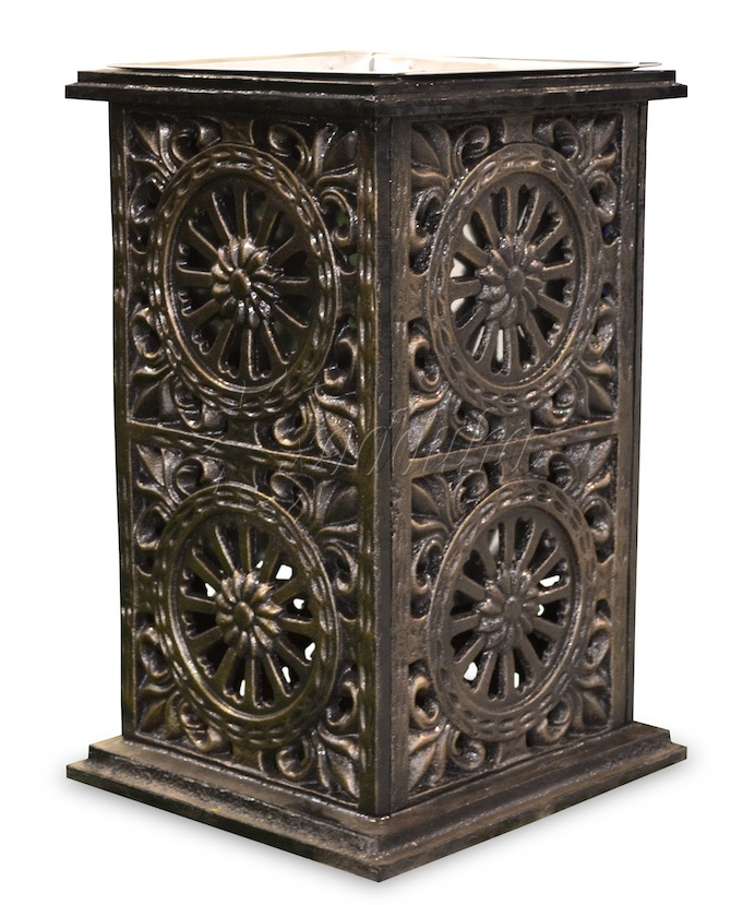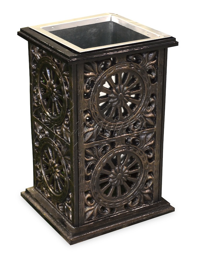 Урна чугунная квадратная «валдай» объём: 42 литра. Подробные характеристики Материалы: Боковины: Чугунное художественное литьё. Покрыты порошковой полимерной краской. Возможность выбора цвета по каталогу RAL. Стандартный цвет (по умолчанию) - черный + бронзовое патинирование. Ёмкость для мусора: Оцинкованное съёмное ведро. Технические характеристики: Объём: 42 л Высота: 720 мм Ширина: 400 мм Глубина: 400 мм Вес: от 90 кг О модели Массивная, парковая урна, оборудованная съемным ведром. Размеры и вес урны обеспечивают ее сохранность. Данная модель популярна при обустройстве больших классических парков в сочетании со скамейками на чугунном основании.