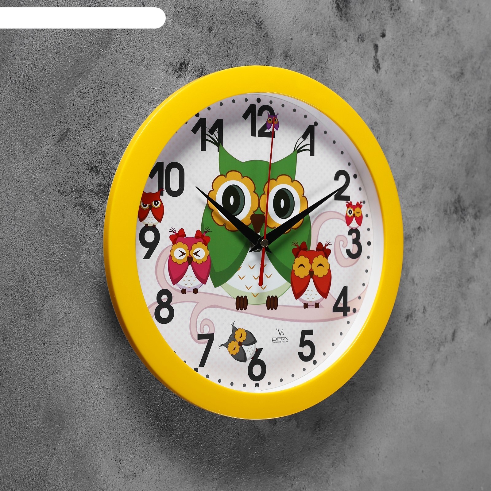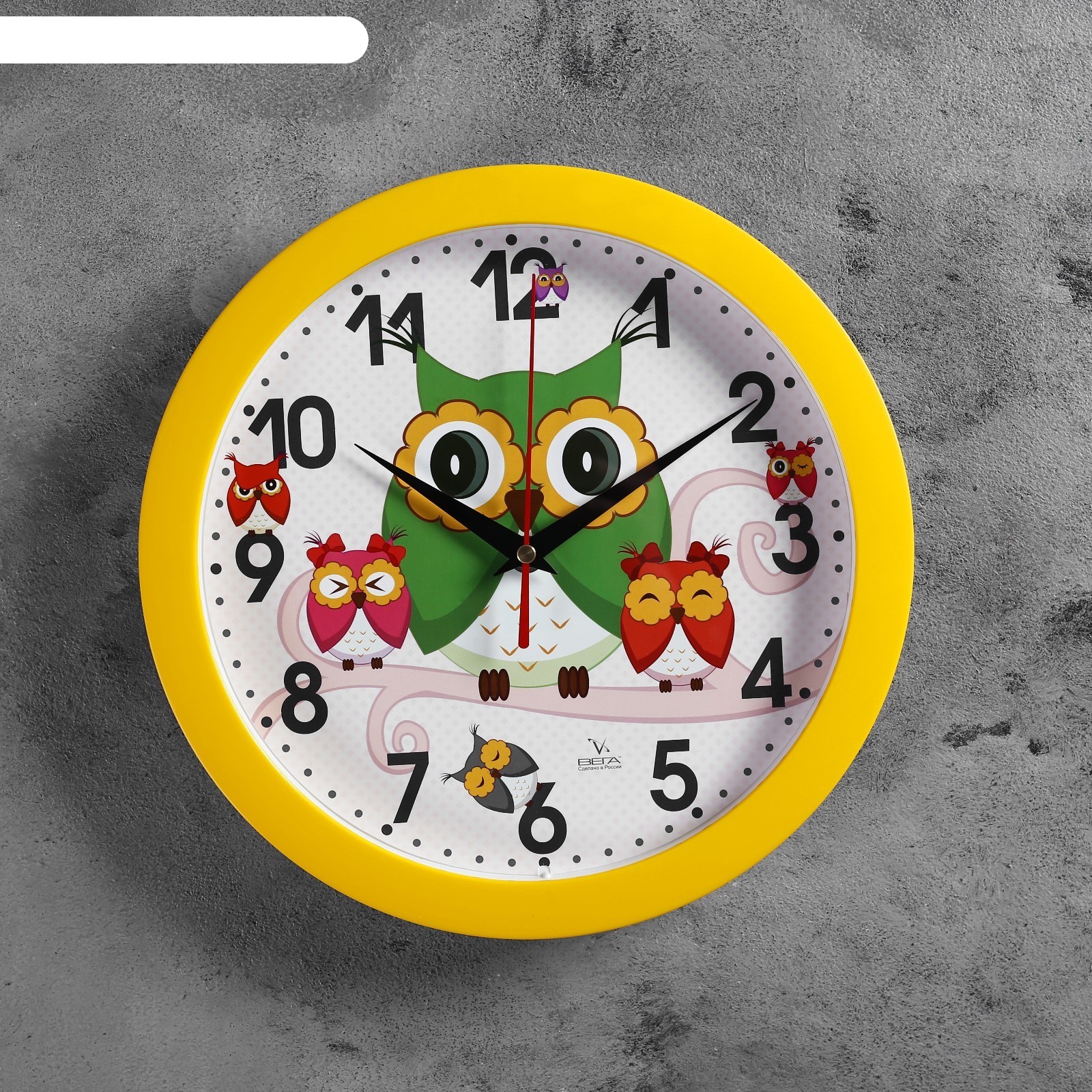 Часы настенные круглые сова детские, желтые. Размер: 28,5 см х 28,5 см х 4,5 см Вес, гр: 680 Материал: Пластик, стекло Производство: Вега Страна: Россия Форма: Круглая Размер, см: 28.5 х 28.5 Тематика: Детская Тип индикации: Арабские цифры Ход: Плавный РосЗакуп: Да Склад: КИУ 1  развернуть описание ▼
