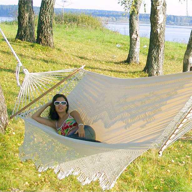 Гамак двухместный lite tulip белый для хобби и пикника. Красивый большой гамак TULIP сделан вручную из высококачественного хлопка. Мягкая фактура материала прекрасно адаптируется к форме вашего тела. Полотно гамака украшено бахромой, сплетенной вручную из волокон настоящего бразильского ореха - дерева, растущего только на севере Бразилии, из бразильского ореха делаются и стропы - петли. Для поперечных перекладин используется древесина Массарандуба, продукция заверена SmartWood, компанией, которая придерживается строгих экологических стандартов. Размеры гамака позволяют уютно расположиться вдвоем, наслаждаясь приятным отдыхом на природе, а в доме стать также украшением интерьера. Доступные цвета: белый, оранжевый, зеленый, синий. Размер, см 230 X 165 Страна производства Бразилия Максимальная нагрузка, кг 180 Вес, кг 3 Цвет белый