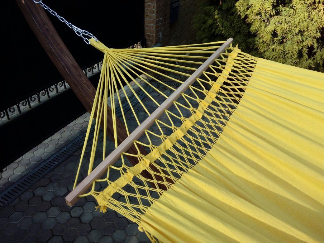 Гамак двухместный lite tulip желтый для хобби и пикника. Красивый большой гамак TULIP сделан вручную из высококачественного хлопка. Мягкая фактура материала прекрасно адаптируется к форме вашего тела. Полотно гамака украшено бахромой, сплетенной вручную из волокон настоящего бразильского ореха - дерева, растущего только на севере Бразилии, из бразильского ореха делаются и стропы - петли. Для поперечных перекладин используется древесина Массарандуба, продукция заверена SmartWood, компанией, которая придерживается строгих экологических стандартов. Размеры гамака позволяют уютно расположиться вдвоем, наслаждаясь приятным отдыхом на природе, а в доме стать также украшением интерьера. Доступные цвета: белый, оранжевый, зеленый, синий. Размер, см 230 X 165 Страна производства Бразилия Максимальная нагрузка, кг 180 Вес, кг 3 Цвет желтый