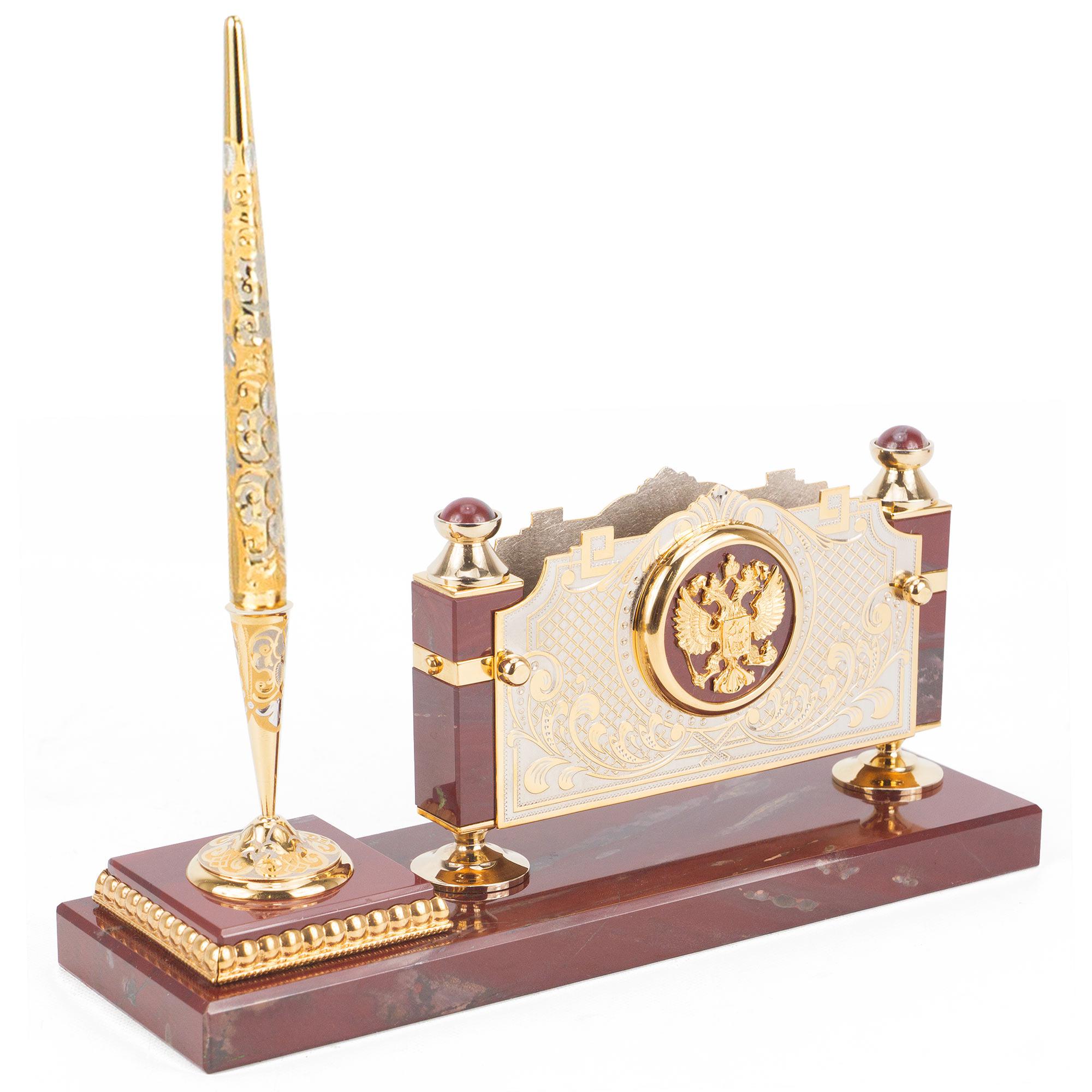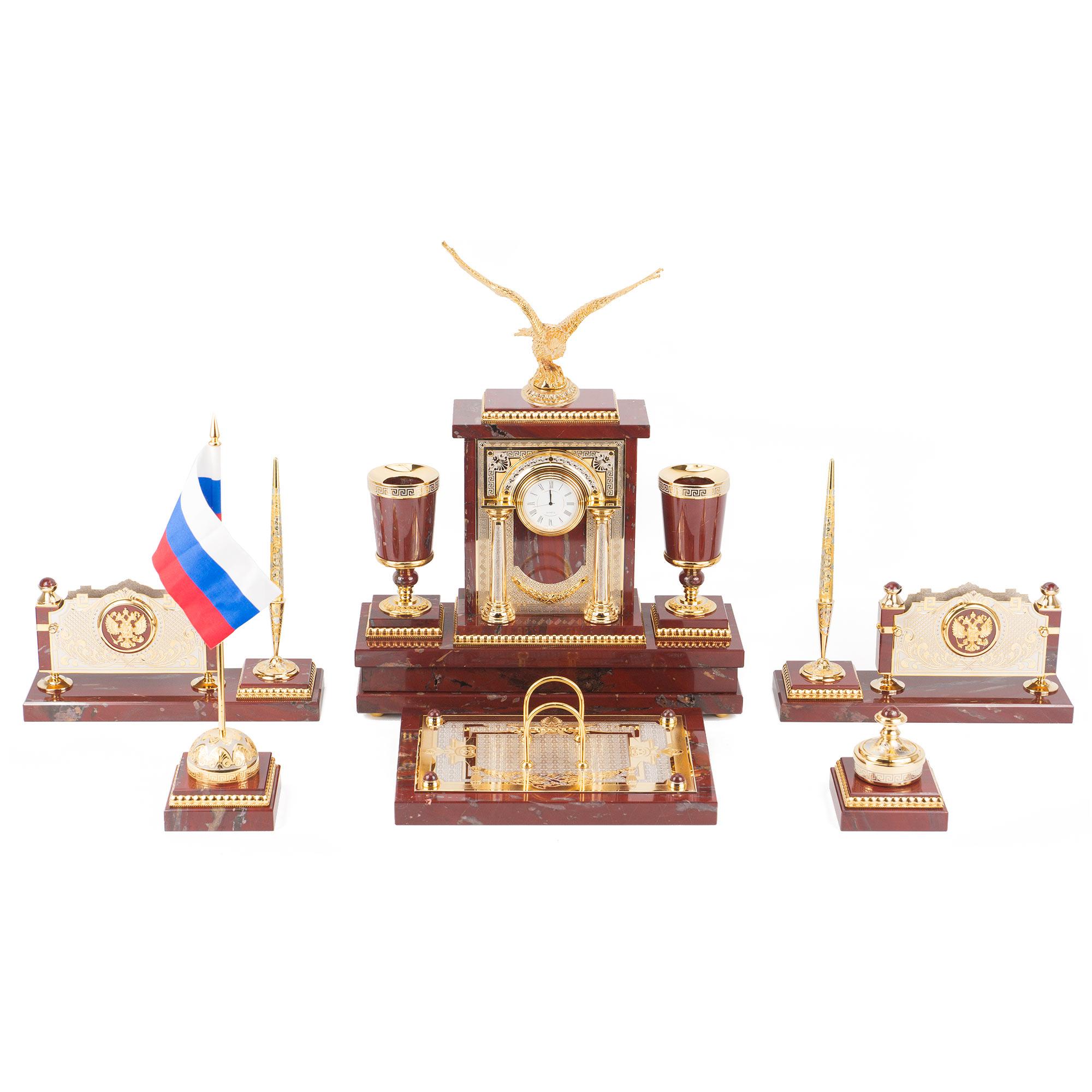 Настольный набор "орел" яшма позолота. Вес 22000 г Размер часы 32х11х38,5 см, визитница 24,5х8х11 см, календарница 24.5х16,5х3,5 см, печать 8х8х8,5 см, флагшток 8х8х32 см. Материал яшма, бронза, никель, покрытие золотом (999,9).  развернуть описание ▼