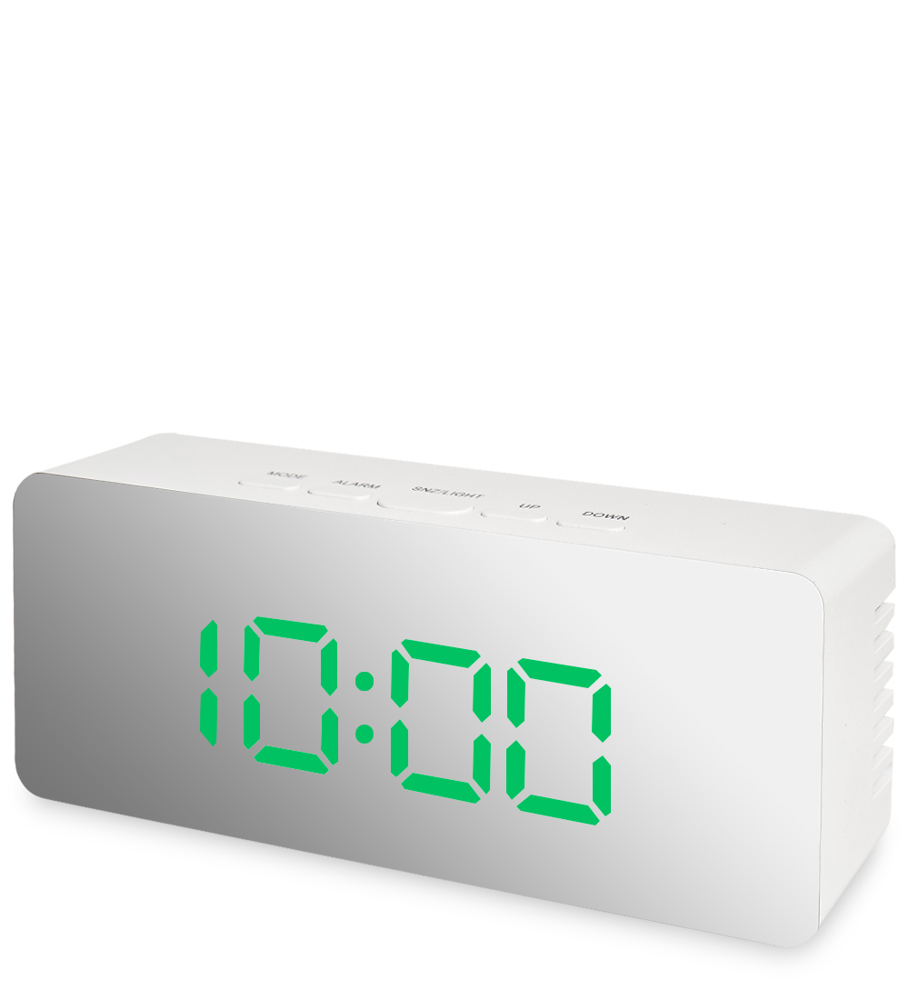 Ял-07-23/3 часы электронные мал. зеркальные (белые с зеленым циферблатом). Страна производства: Китай Длина: 14.00 см Ширина: 3.50 см Высота: 6.00 см