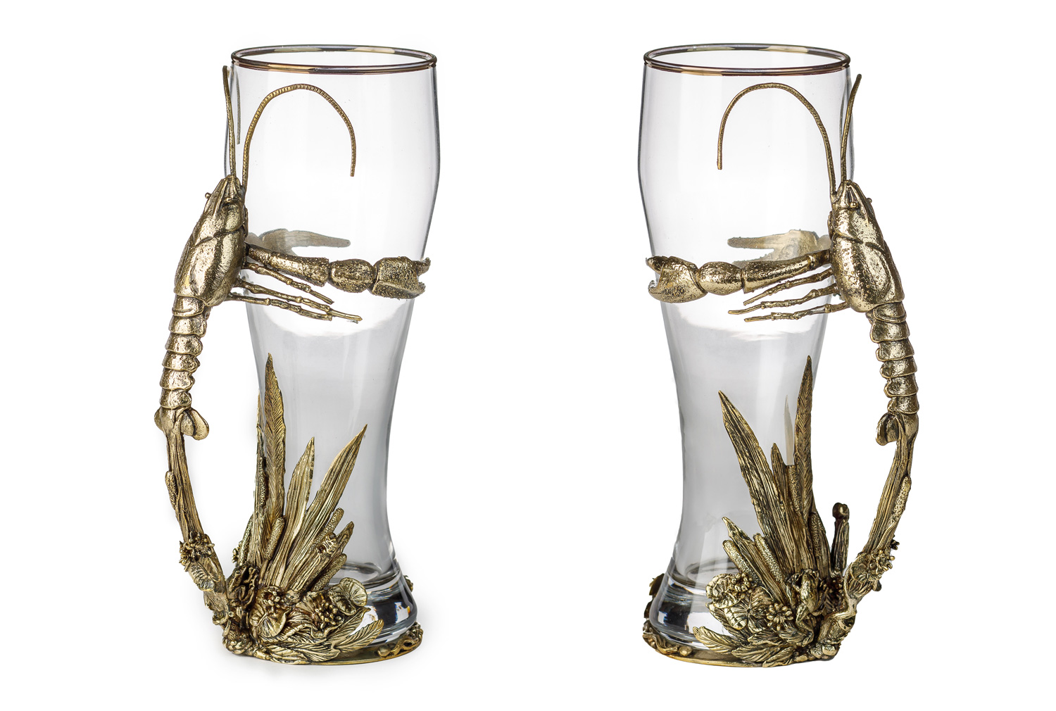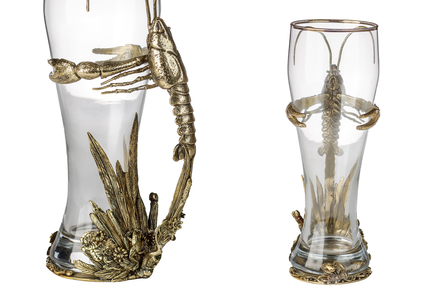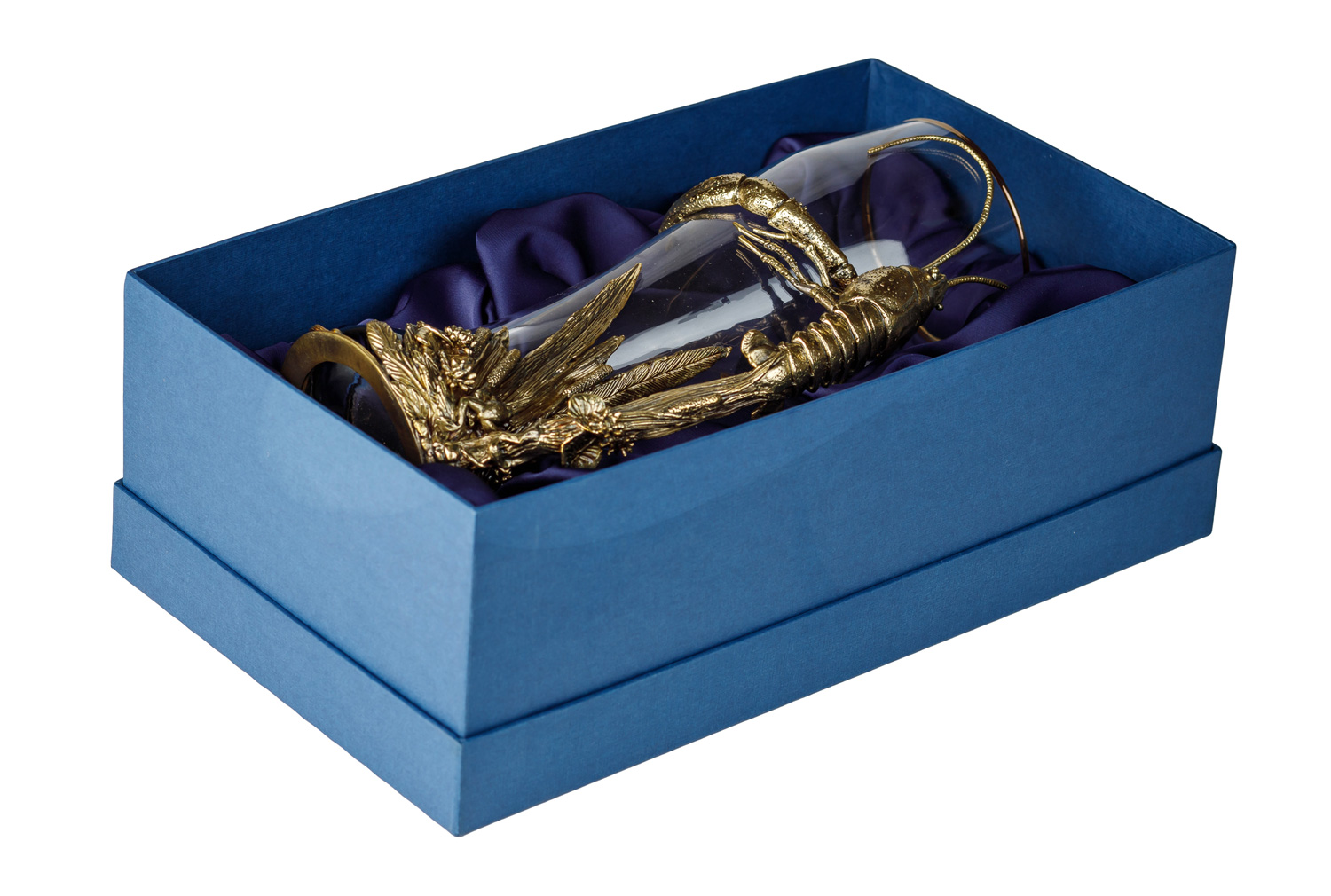 Лапы рака плотно обхватили кружку и кажется, он вот-вот выберется на самый верх, к краю бокала, украшенного тонкой окантовкой в виде золота. Внизу, у круглого основания, можно увидеть траву, растущую в озере, и разных его жителей. Кружка упакована в изысканную упаковку с атласом внутри.