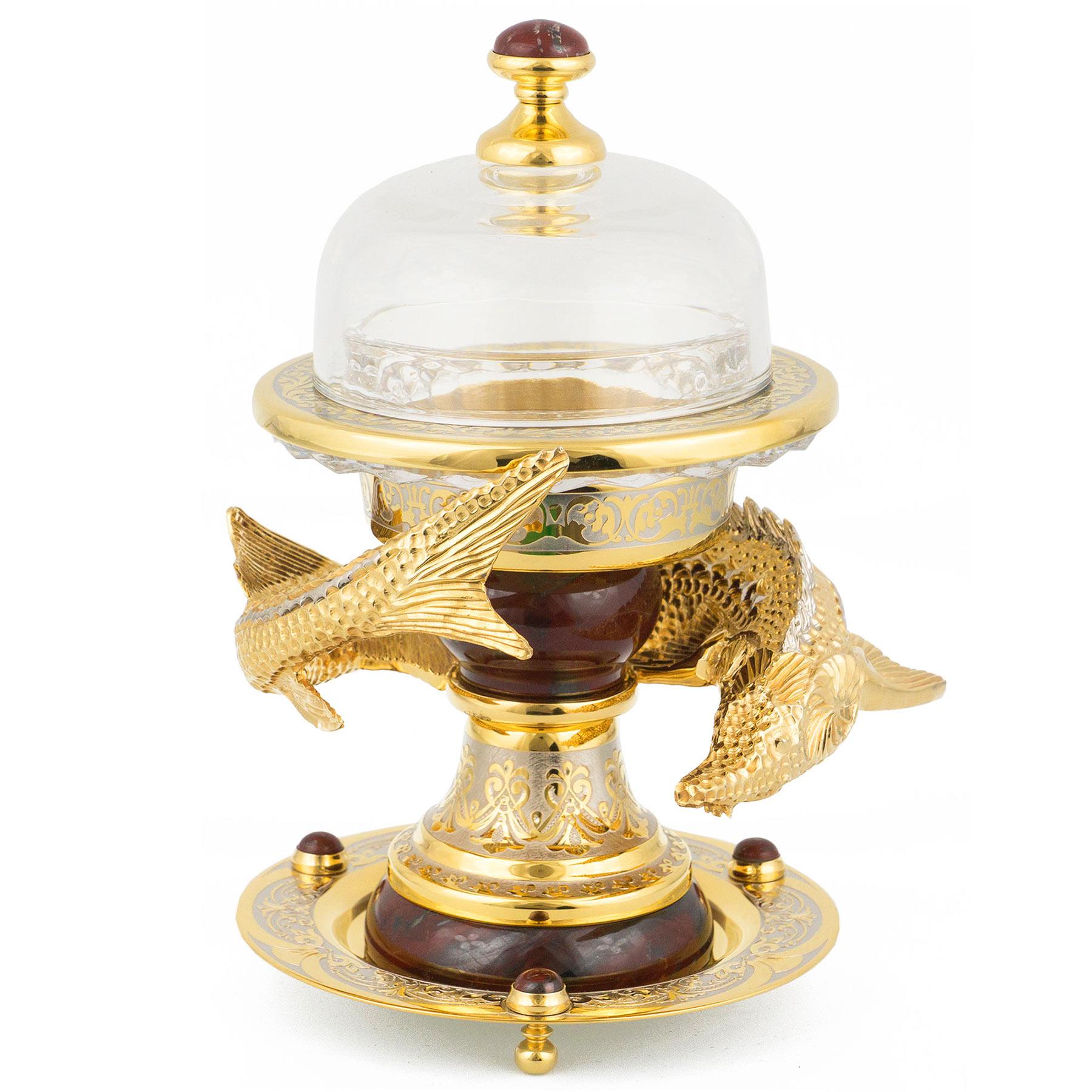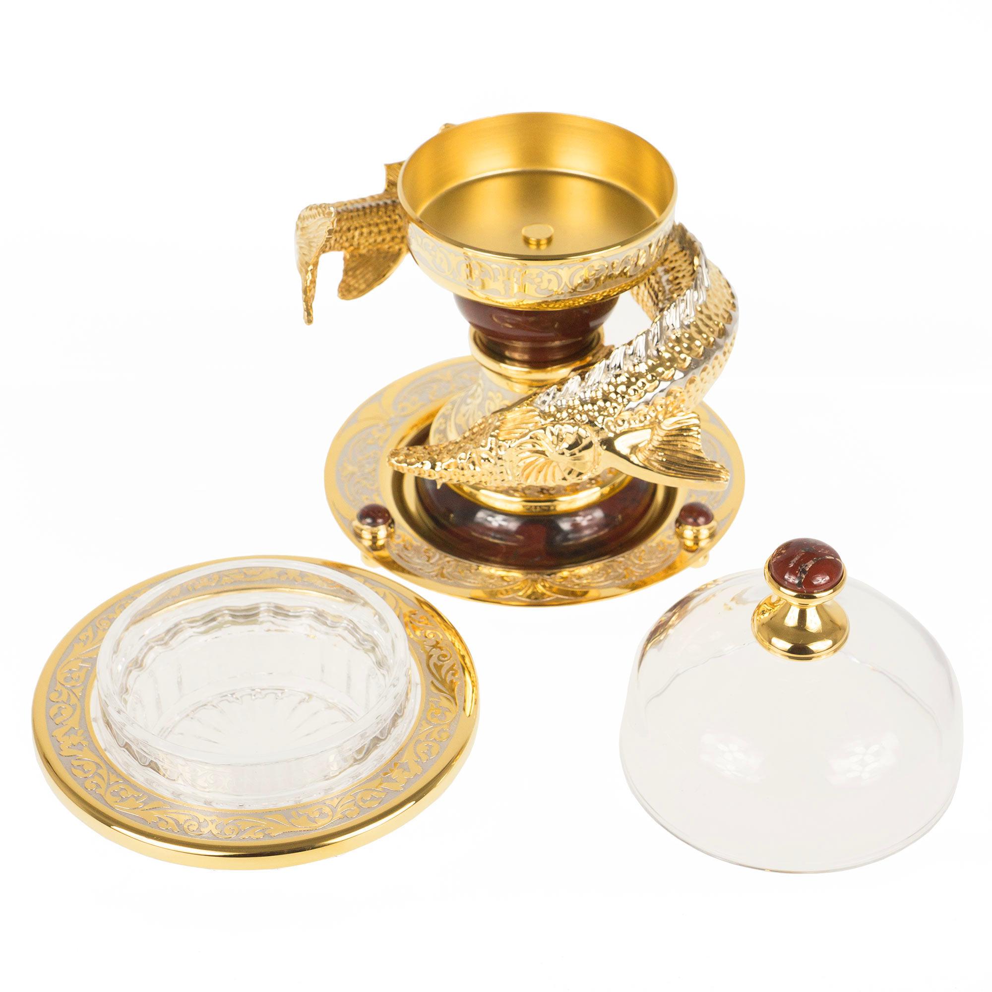 Икорница "осетр" яшма позолота 140х140х220 мм 4170 гр.. Вес 4170 г Размер 14х14х22 см Материал яшма, хрусталь, латунь, никель, покрытие золотом (999,9).  развернуть описание ▼