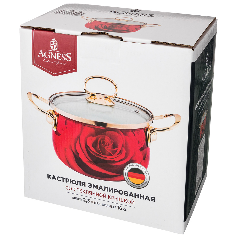 Кастрюля эмалированная Agness со стеклянной крышкой, 2,3л, диа. 16см