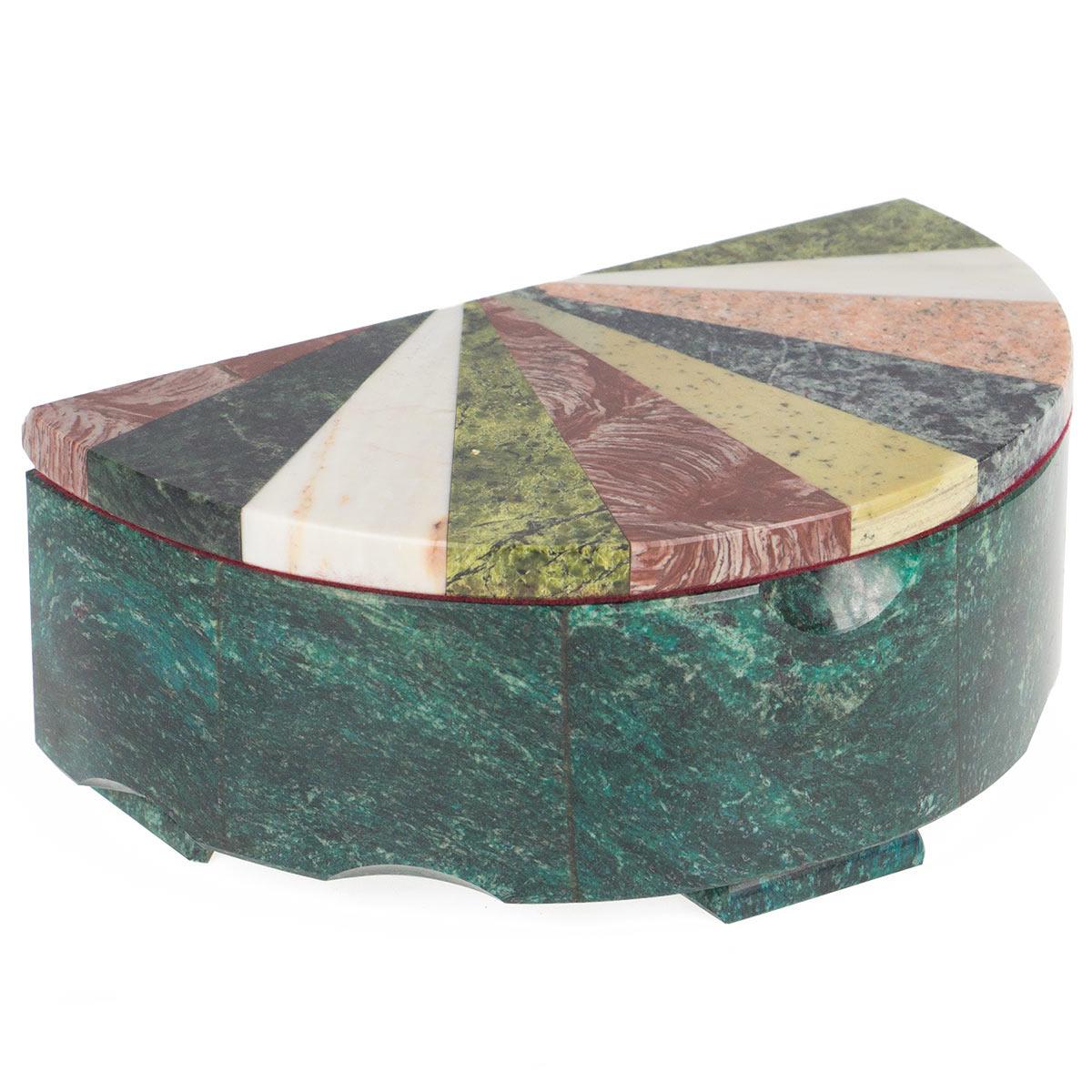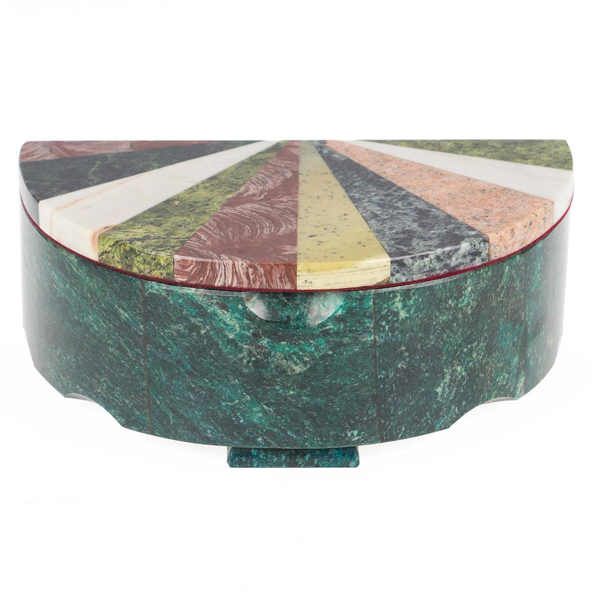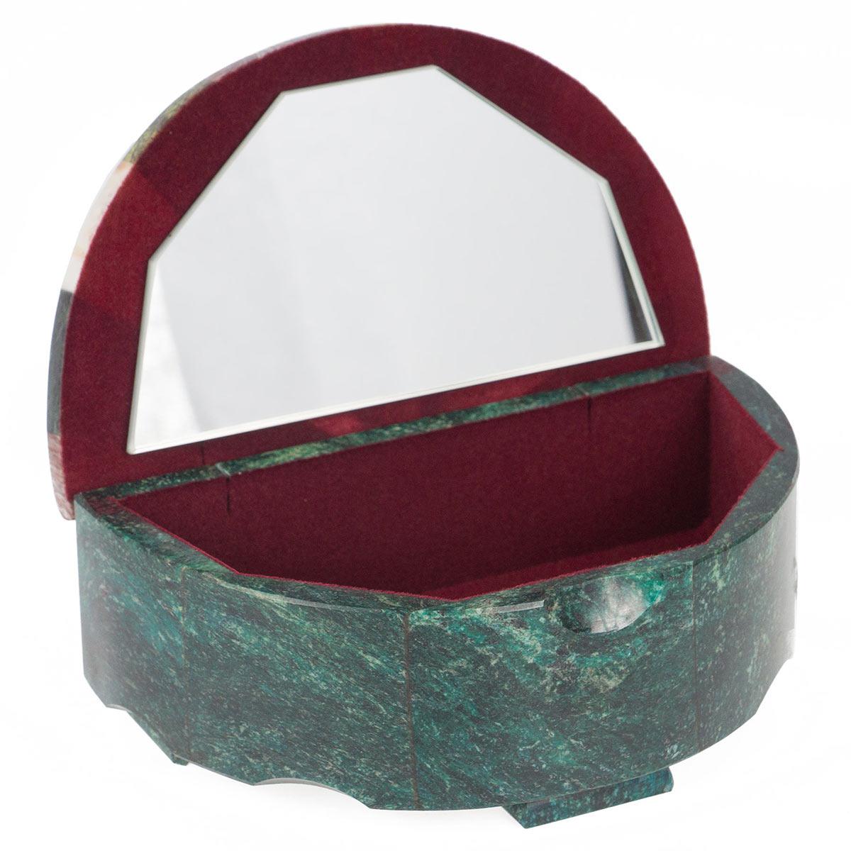 Шкатулка овал с мозаикой креноид змеевик офиокальцит мрамор 200х190х80 мм . Вес 1750 г Размер 20х19х8 см Материал змеевик, мрамор, лемезит, офиокальцит, креноид и др. уральские камни  развернуть описание ▼