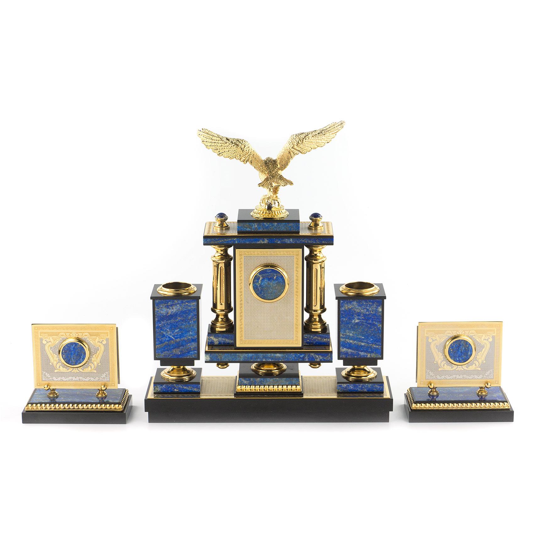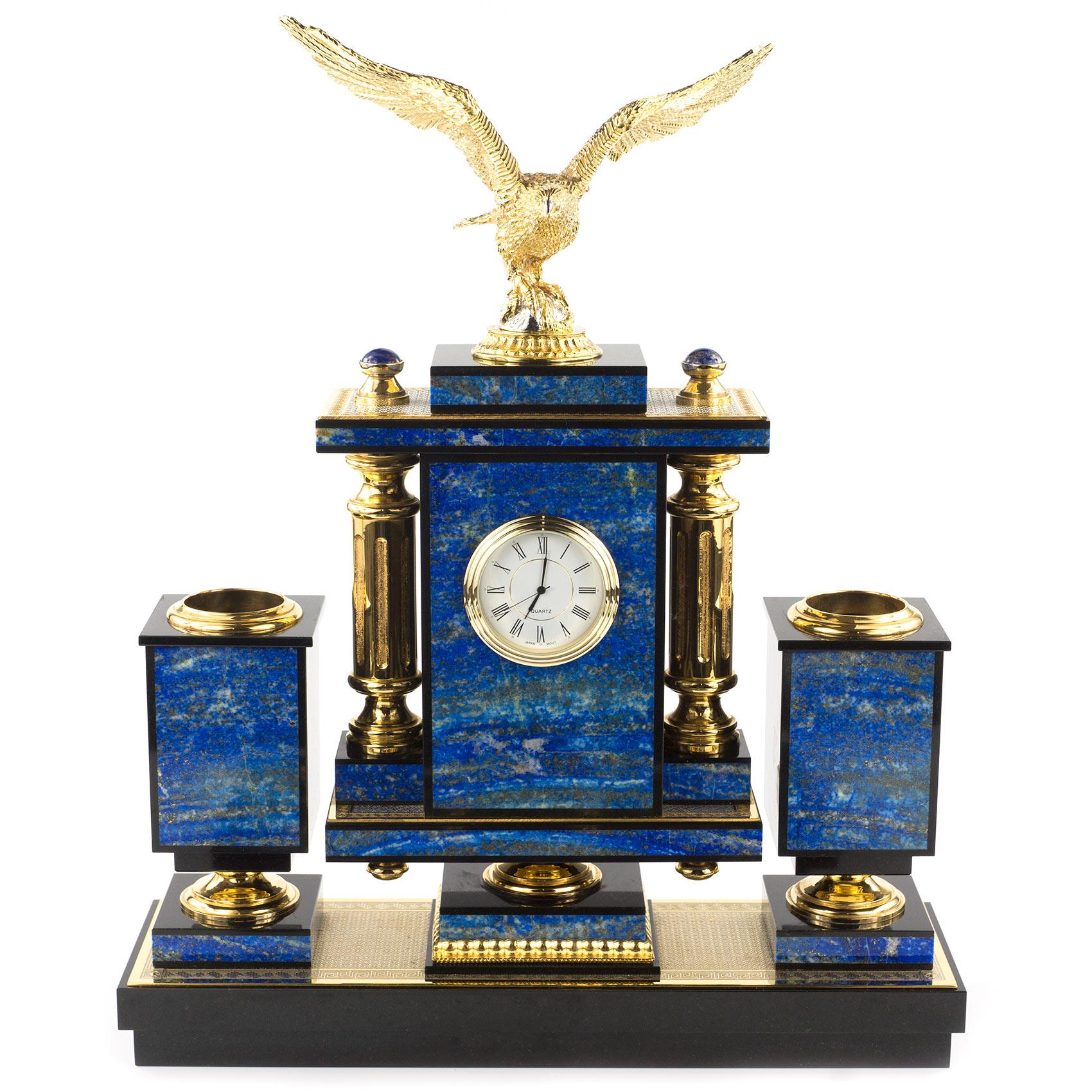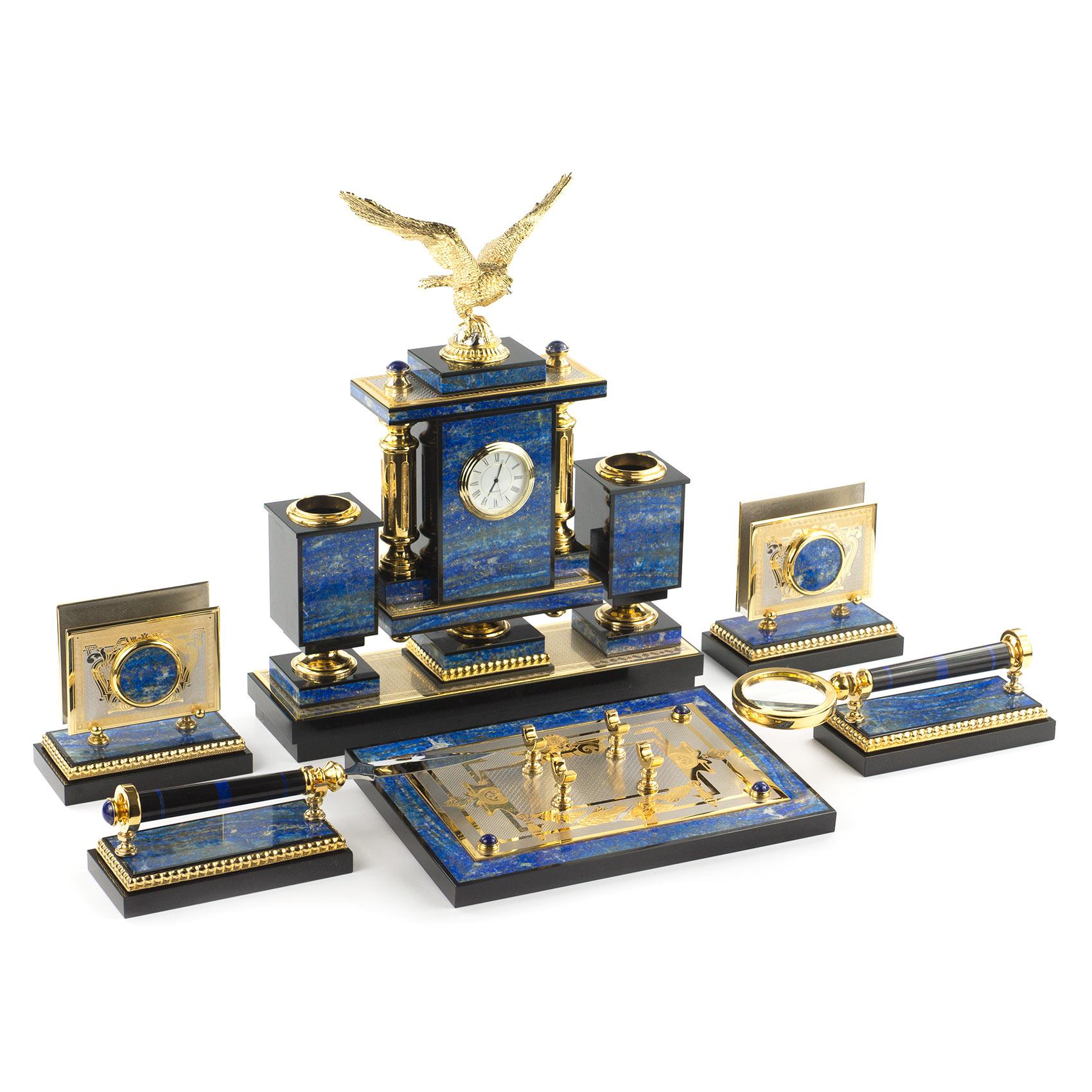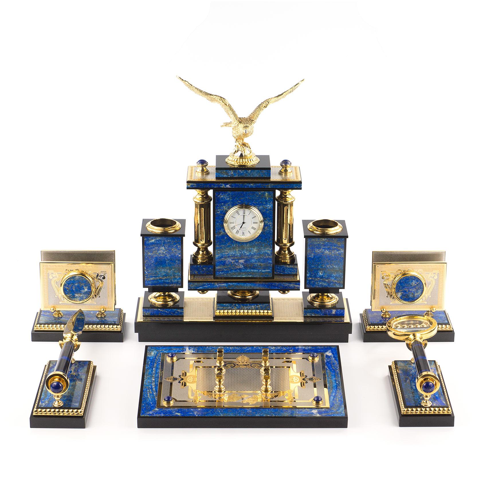 Настольный набор "орел" лазурит позолота. Вес 22000 г Размер часы 31х9х39 см, визитница 13х7х12 см, календарница 26х18х3 см, нож 24х3х2 см, лупа 20х7х2 см. Материал лазурит, долерит, бронза, покрытие золотом (999,9).  развернуть описание ▼