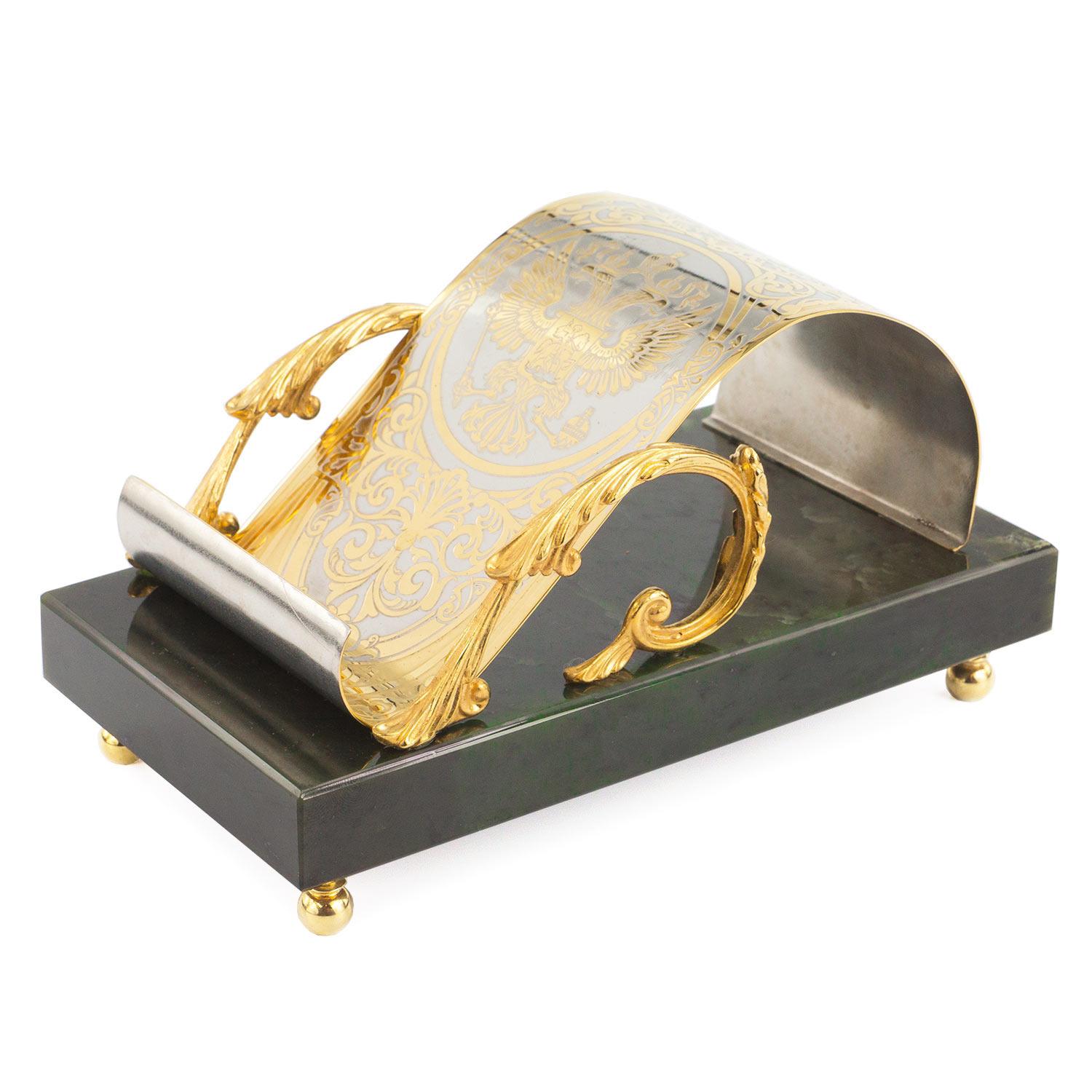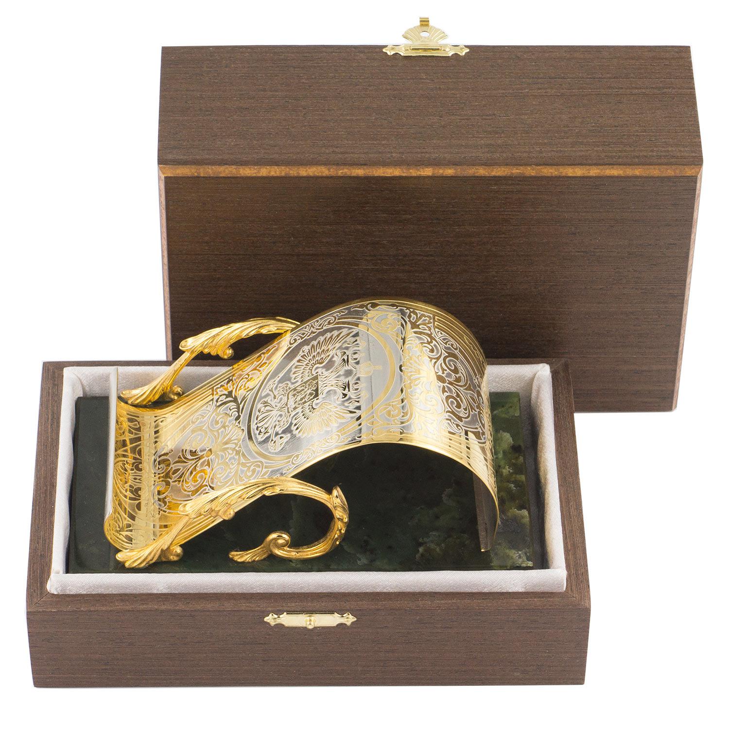 Подставка под телефон "герб россии" нефрит 155х90х75 мм 1590 гр.. Вес 1590 г Размер 15,5х9х7,5 см Материал нефрит, латунь, никель, покрытие золотом (999,9). Месторождение Миасское, Челябинская область, Россия  развернуть описание ▼