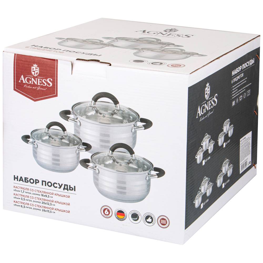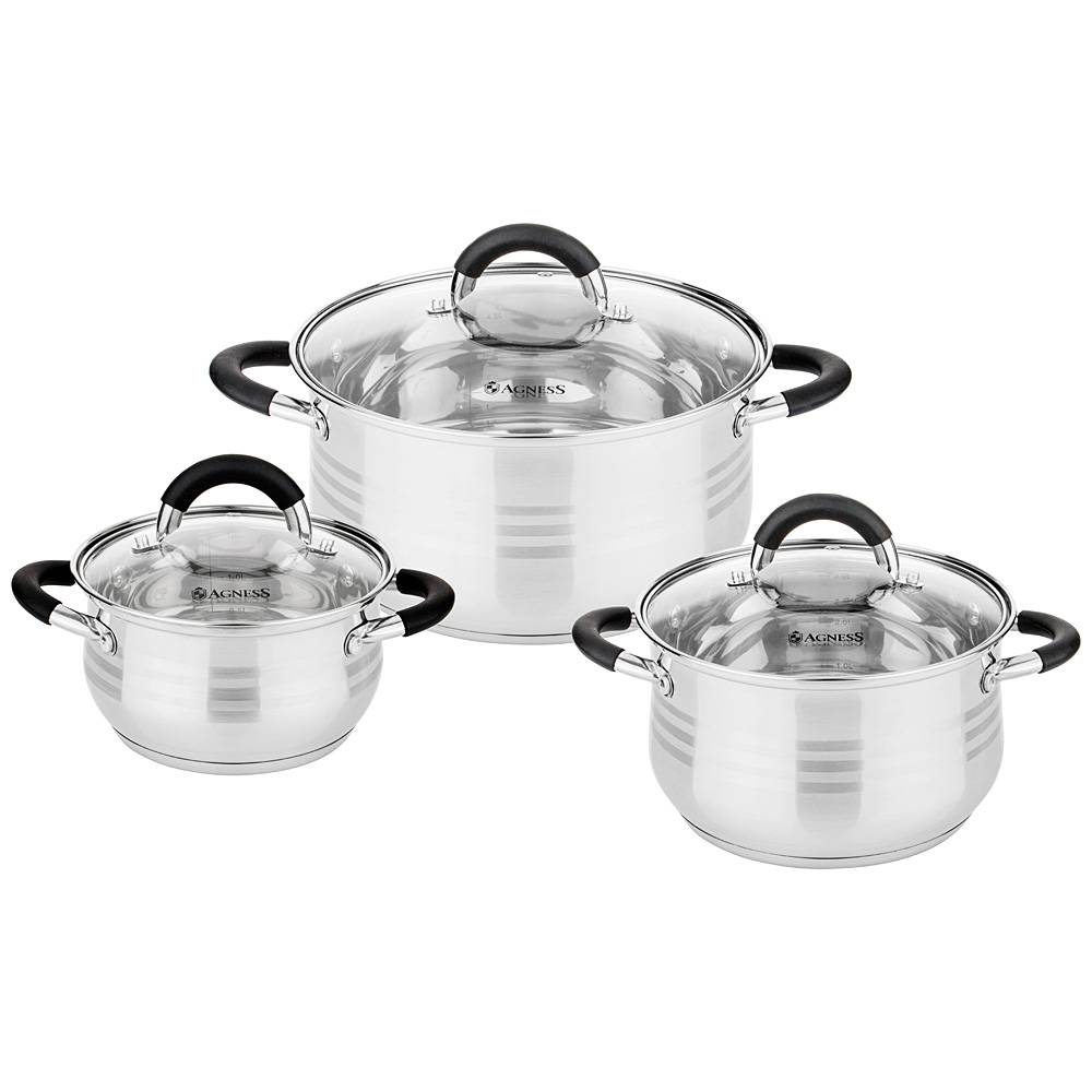 Набор кастрюль Agness со стекл.крышками 6пр.1,7/3,5/6,5 л. размер 16x9,5/2