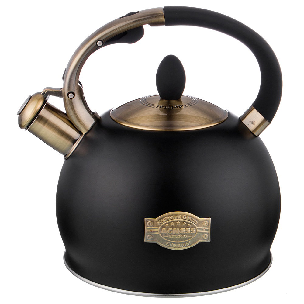 Чайник agness со свистком 3,0 л термоаккумулирующее дно, индукция. ЧАЙНИК AGNESS СО СВИСТКОМ, СЕРИЯ ЧЕРНОЕ ЗОЛОТО, 3,0 Л ТЕРМОАККУМУЛИРУЮЩЕЕ ДНО, ИНДУКЦИЯ Чайник AGNESS - это надежность, функциональность и стильный дизайн. Чайник выполнен из нержавеющей стали - наиболее прочного и гигиеничного материала. Преимущества: • Капсульное термоаккумулирующее дно с прослойкой из алюминия позволяет воде в чайнике дольше оставаться горячей. Термоаккумулирующее дно ИМЕЕТ МНОГОСЛОЙНУЮ СТРУКТУРУ, в состав которой входит толстая пластина из алюминия, запрессованная под высоким давлением с металлическим диском, еще одной пластиной из алюминия, и эта конструкция закрывается капсулой из нержавеющей стали. Благодаря высокой теплопроводности алюминия термоаккумулирующее дно имеет свойства накапливать (аккумулировать) тепло и быстро и равномерно распределять его по всей поверхности посуды. В чайниках с термоаккумулирующим дном вода закипает быстрее, и дольше остается горячей. • Легко наливать воду. Используя клапан на ручке чайника, вы легко сможете налить воду. Просто нажмите на клапан, чтобы открыть носик чайника. • Встроенный свисток подскажет, что вода в чайнике закипела и его пора снимать с плиты. • Благодаря внешнее жаропрочному покрытию и стильному дизайну чайник AGNESS украсит любую кухню • Подходит для всех типов плит, включая Индукционные Металлический чайник AGNESS - незаменимый атрибут в Вашем доме, а также прекрасный подарок для Ваших близких. • Размеры чайника: общий диаметр дна 18 см, индукционное дно13 см, высота 24 см Внимание! Не нагревайте пустой чайник. Рекомендуется нагревать чайник, наполнив его на 2/3 от общего объема. Следите, чтобы диаметр конфорки совпадал или был меньше диаметра дна чайника. Пламя от газовой конфорки не должно попадать на корпус чайника. Не подходит для использования в микроволновой печи и посудомоечной машине. Рекомендована ручная мойка. Материал: Нержавеющая сталь Микроволновая печь: Нет Объем, л: 3 Посудомоечная машина: Нет Серия: Черное золото Бренд: Agness Страна: КИТАЙ Маркировка: Нет Вес: 1.330 кг Длина коробки: 20 см Ширина коробки: 20 см Высота коробки: 25 см