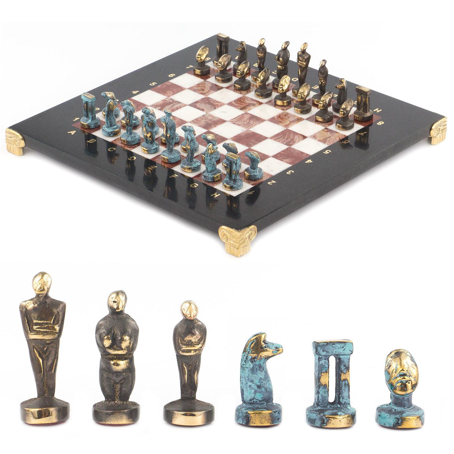 Шахматы "идолы" доска 280х280 мм мрамор лемезит металл. Вес 6100 г Размер доска 28х28х2,5 см, клетка 2,5х2,5 см, высота фигур: пешка 2,5 см, король 5 см Материал доска из белого мрамора, лемезита и черного змеевика, фигуры замак  развернуть описание ▼