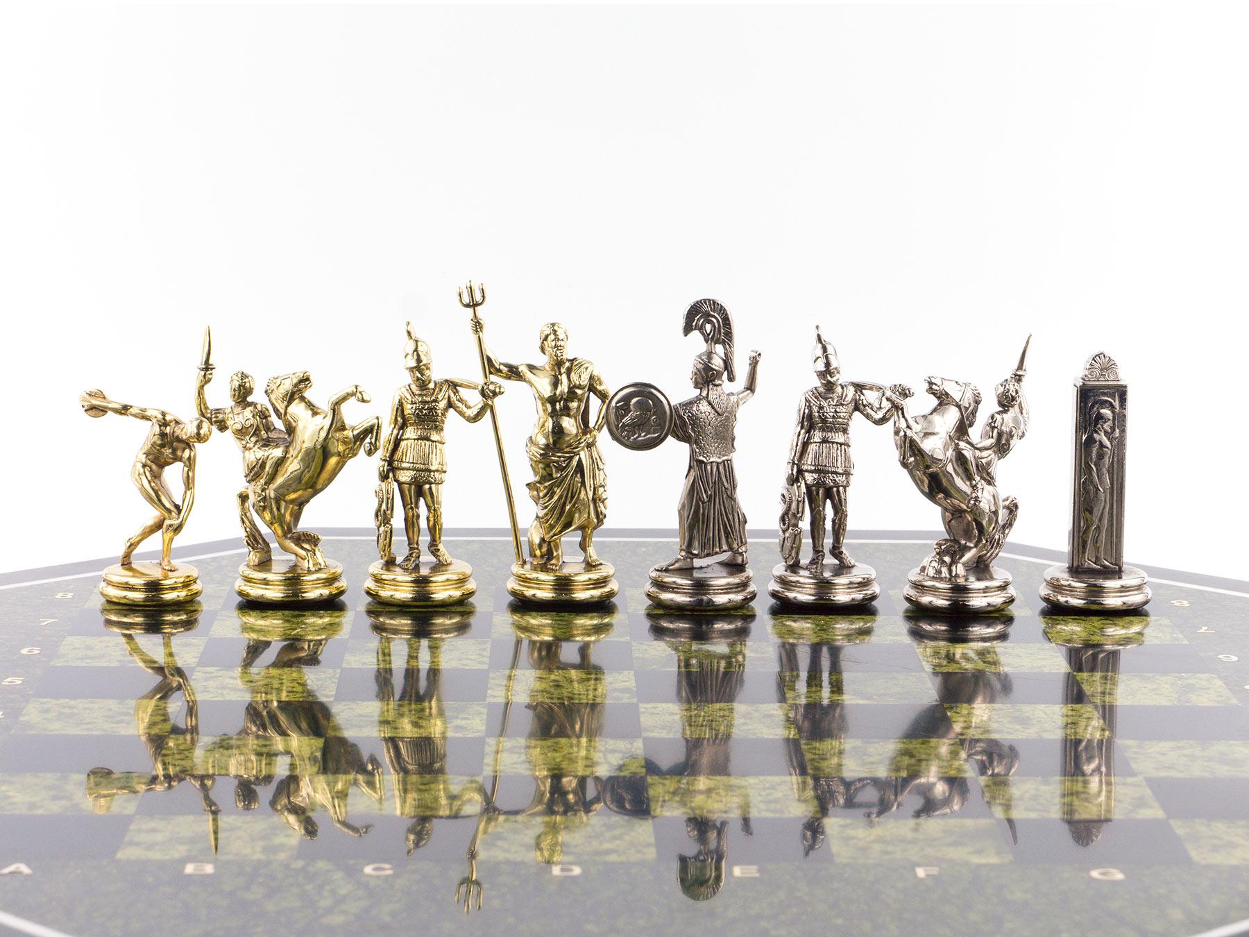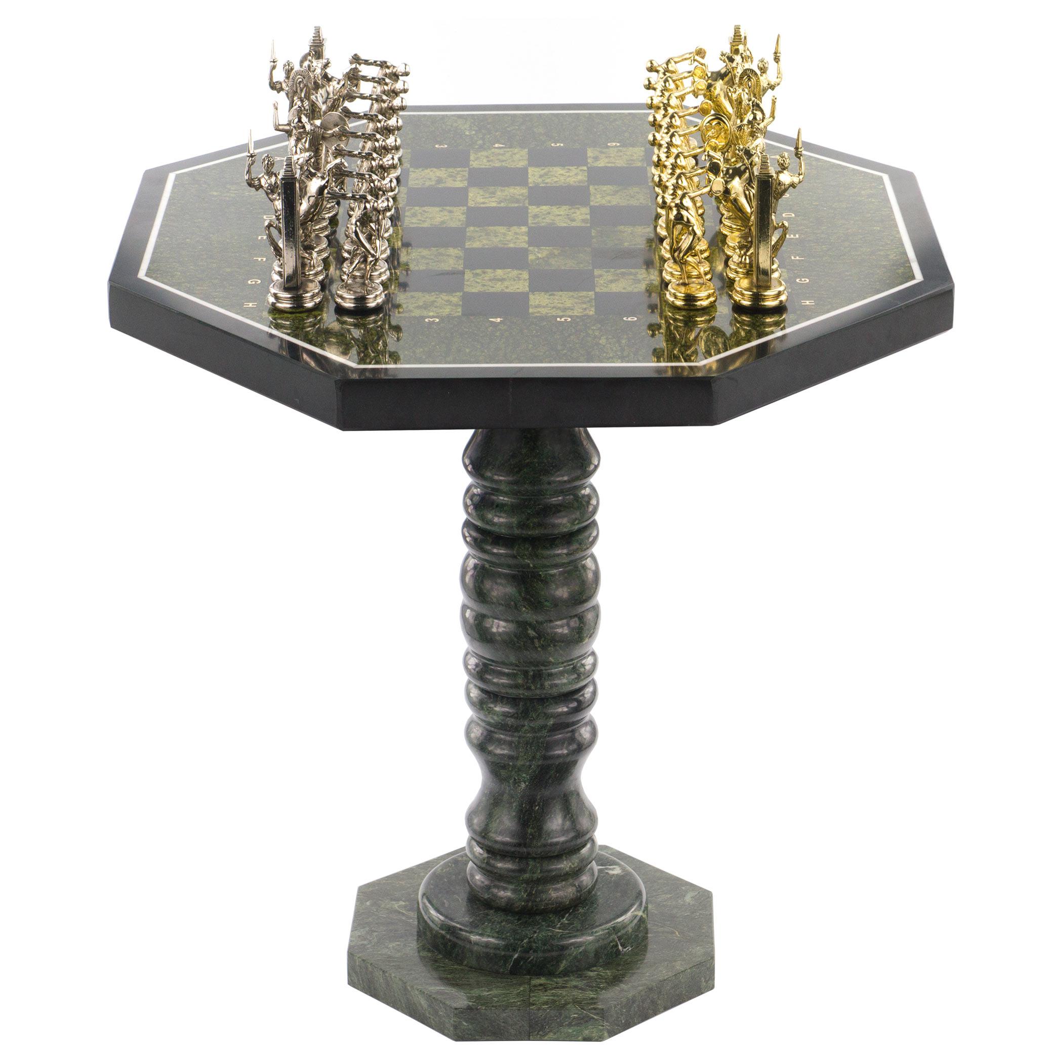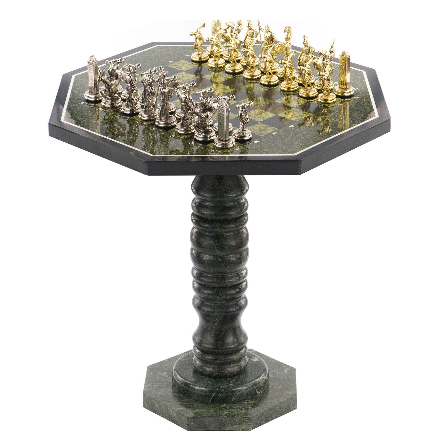 Шахматный стол фигуры "метатели дисков" змеевик металл 600х600х6. Вес 45000 г Размер стол 60х60х62 см, клетка 4,5х4,5 см, высота фигур: пешка 7,4 см, король 11 см Материал стол из змеевика, фигуры из сплава замак  развернуть описание ▼
