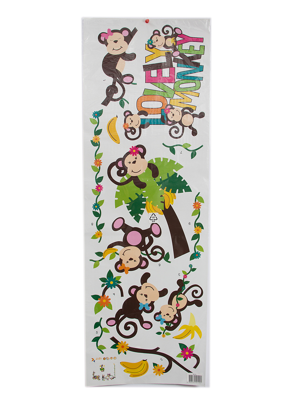 Наклейка lovely monkey 57*81см. Артикул: 95101 Материал: PVC Назначение: Детская Направленность: Детские Праздник: 1 сентября, 8 марта, День учителя Сертификация: Товар не подлежит обязательной сертификации. Состав: PVC.