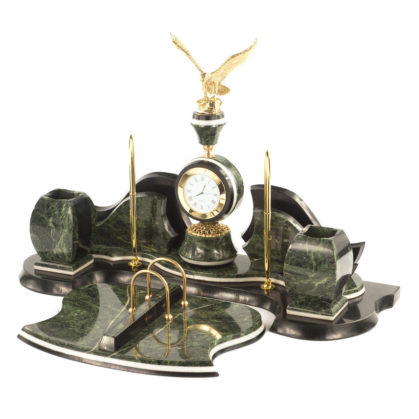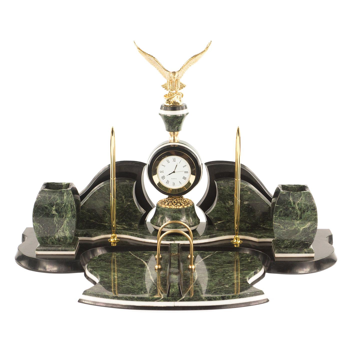 Настольный набор "орел" змеевик. Вес 7000 г Размер часы 47х17х31 см, календарница 25,5х19,5х3,3 см Материал змеевик, бронза, мрамор  развернуть описание ▼