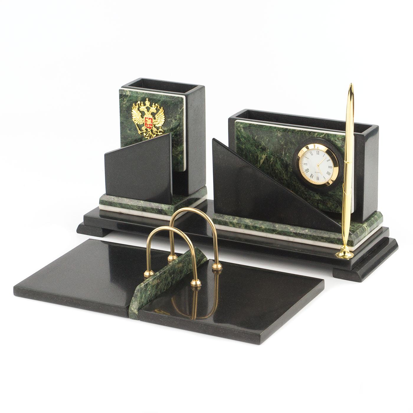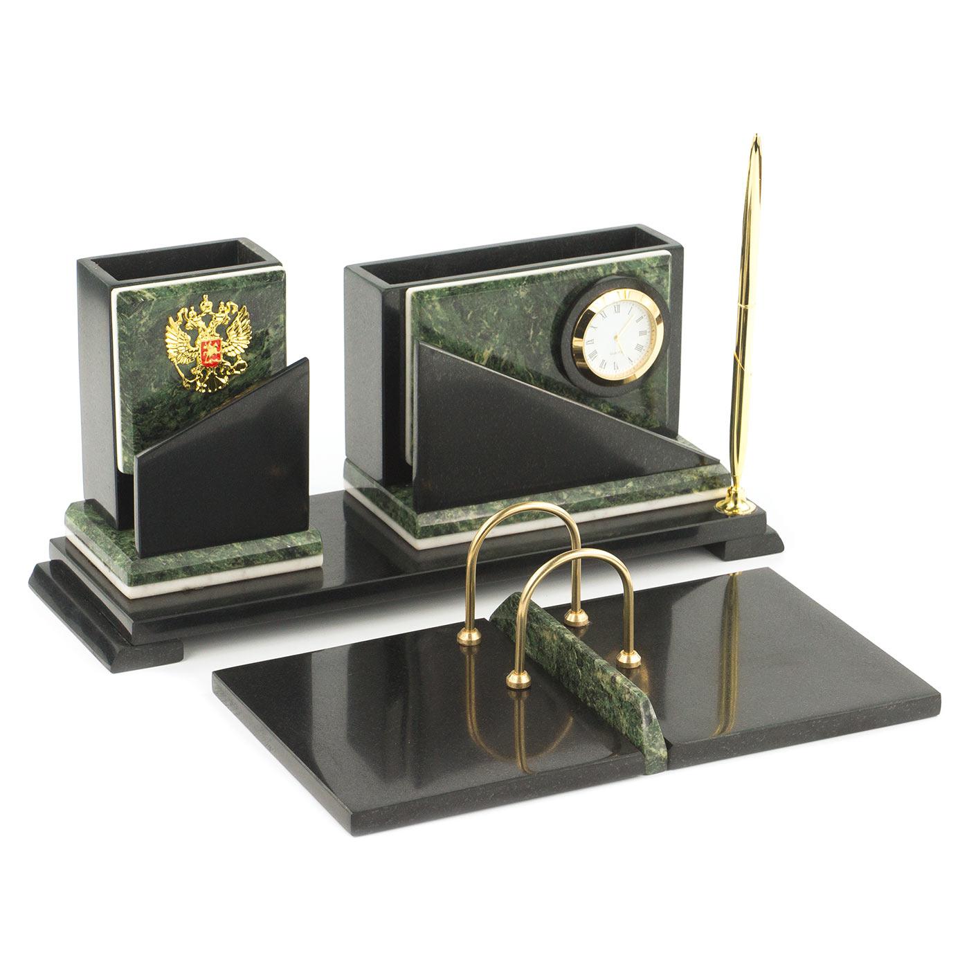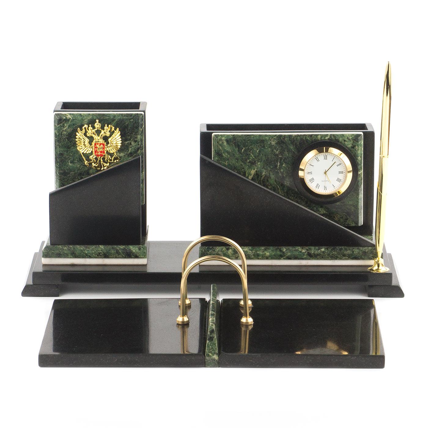 Настольный набор змеевик 320х240х145 мм 4900 гр.. Вес 4900 г Размер часы 32х10х14,5 см, календарница 26х14 см Материал змеевик, мрамор  развернуть описание ▼