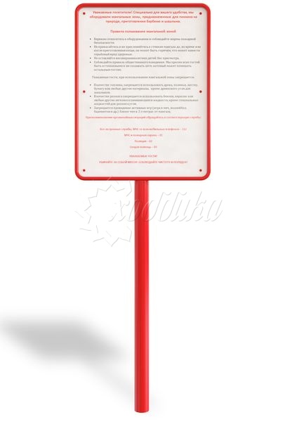 Информационная табличка «пикник» стандарт. Подробные характеристики Материалы: Опора и рамка: Стальной прокат различного сечения. Защита от коррозии. Покрыты порошковой полимерной краской. Возможность выбора цвета по каталогу RAL. Стандартный цвет (по умолчанию) - черный. Информационное поле: Оцинкованный лист/ударопрочный ПВХ с атмосферостойкой печатью. Фурнитура: Оцинкованная. Возможность выбора цвета фурнитуры по каталогу RAL. Стандартный цвет (по умолчанию) - серебристый. Возможность использования потайной/скрытой фурнитуры. Технические характеристики: Габаритные размеры: Высота: 2 м. Ширина: 60 см Вес: от 80 кг. Дополнительные размеры: Информационное поле 60*80 см.