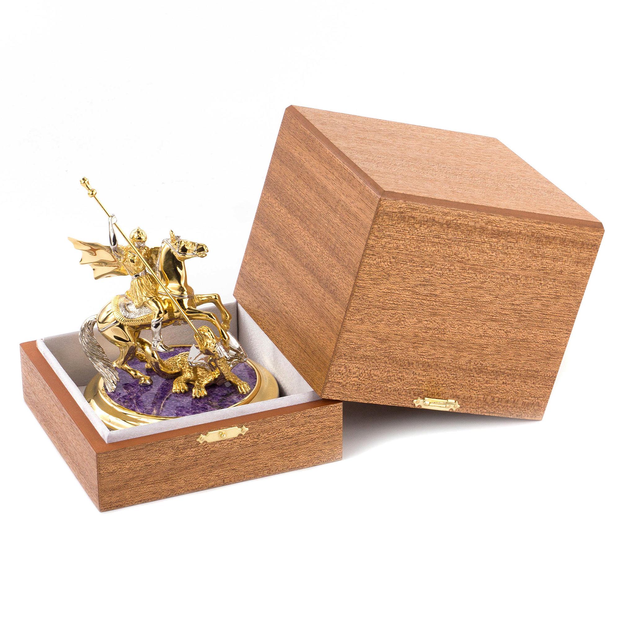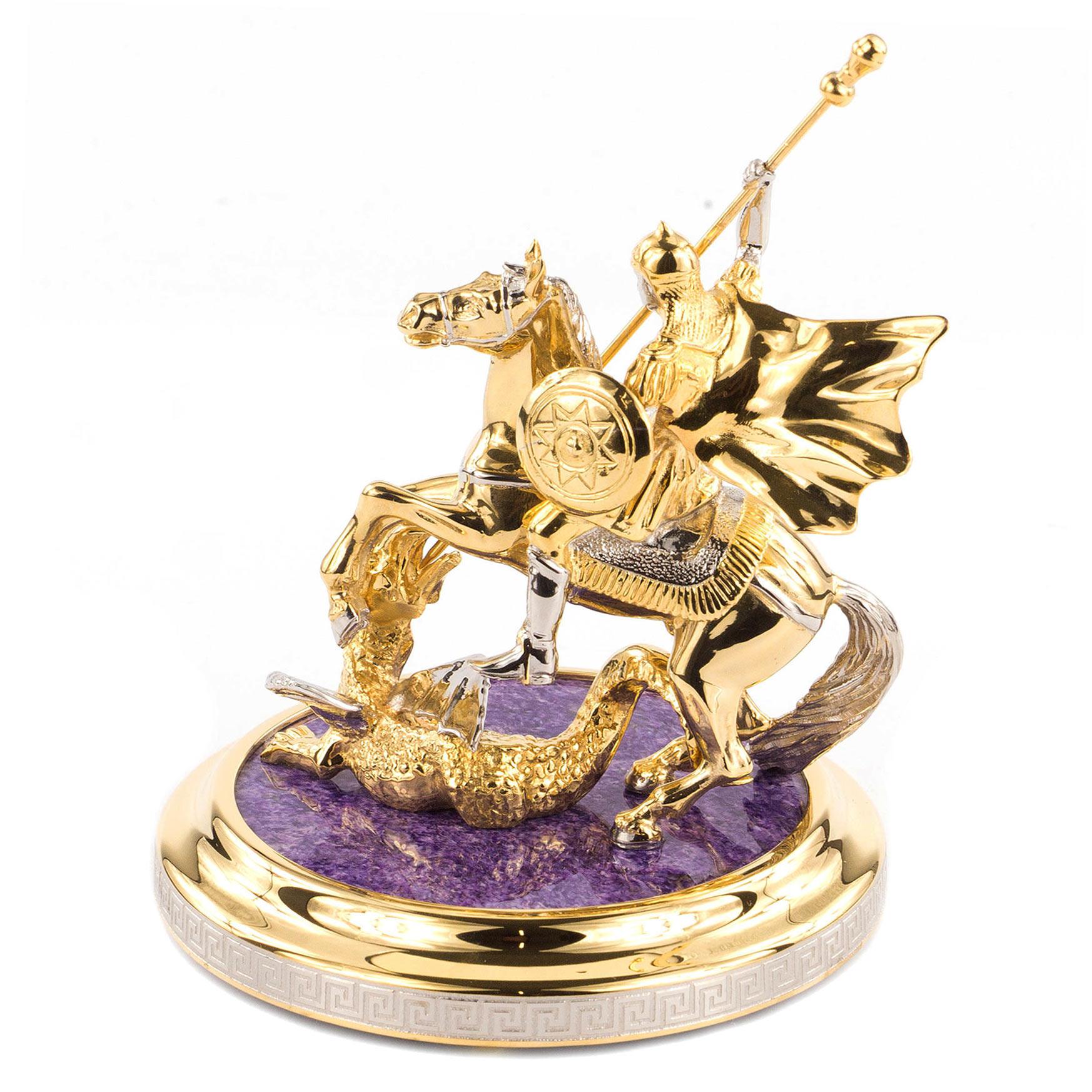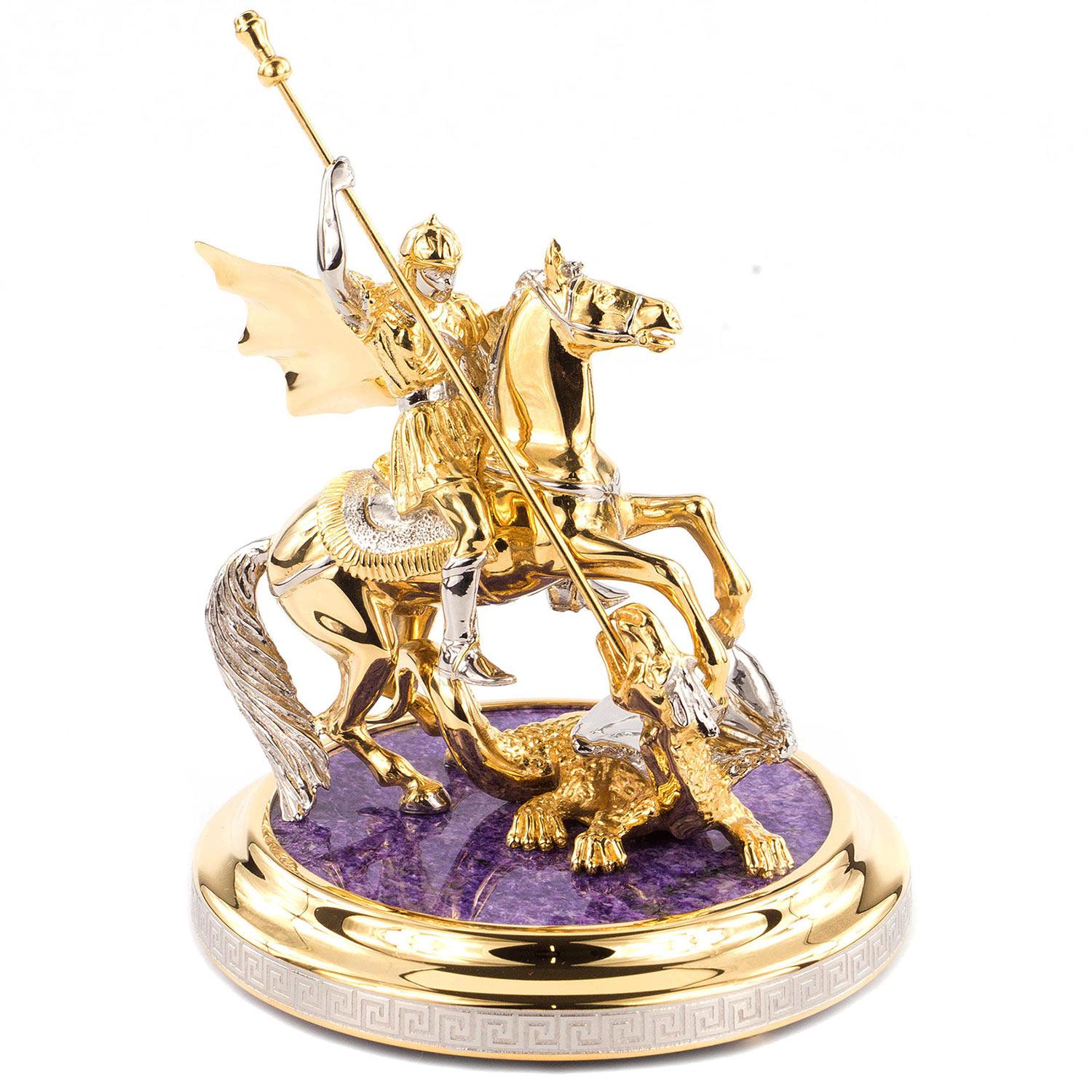 Статуэтка "георгий победоносец" чароит позолота 125х125х155 мм 1. Вес 1850 г Размер 12,5х12,5х15,5 см Материал чароит, латунь, никель, покрытие золотом (999,9).  развернуть описание ▼