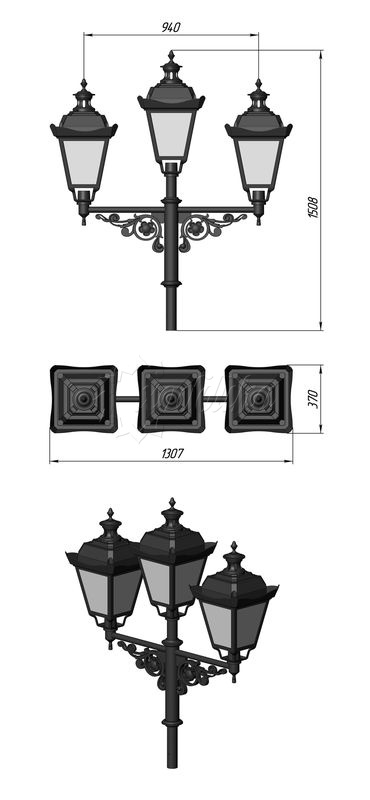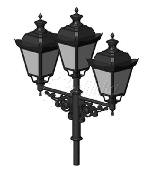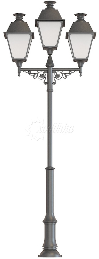 Фонарь уличный «адмирал - 3» со светильниками 4,008 м.. Подробные характеристики Материалы: Основание и кронштейн: Чугунное художественное литьё. Покрыты порошковой полимерной краской. Возможность выбора цвета по каталогу RAL. Стандартный цвет (по умолчанию) - черный + бронзовое патинирование. Стойка: Сталь. Покрыта порошковой полимерной краской. Возможность выбора цвета по каталогу. Стандартный цвет (по умолчанию) - черный + бронзовое патинирование. Светильник: Ретро. Технические характеристики: Источник света: Патрон E-27 под лампу накаливания до 150 Вт, либо энергосберегающую лампу. Возможна комплектация ПРА под Nat70, Nat100, ДРЛ80, ДРЛ125 и источником света. Возможно комплектование светодиодными модулями. Высота: от 4,0 до 6,5 м Вес: от 68 кг Установка производится путем бетонирования стойки (закладного фундамента), либо бетонированием закладной детали с последующим креплением стойки болтовым соединением. Закладной фундамент заказывается отдельно и в цену не входит. О модели Используется для освещения парков, скверов, коттеджных поселков, частных домов, прилегающих территорий зданий. Установка производится путем бетонирования стойки (глубина 1,2 метра), либо бетонированием закладной детали с последующим креплением стойки болтовым соединением.