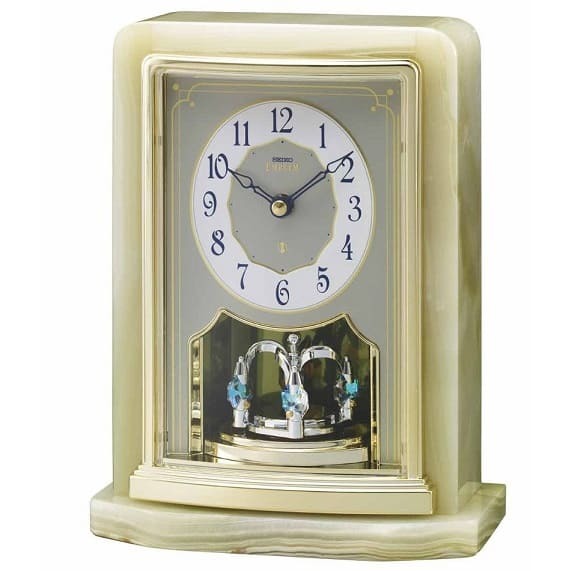 Настольные часы с маятником seiko ahw465gt. Настольные часы с маятником SEIKO AHW465GT Статусные настольные часы с вращающимся маятником (не влияет на ход часов), который декорирован кристаллами Swarovski. Оснащены надежным, долговечным кварцевым механизмом. Питание от 2 пальчиковых батареек (тип АА - входят в комплект). Корпус выполнен из качественного натурального мрамора светлого бело-зеленого цвета. Временные рамки обозначены четкими, хорошо читаемыми арабскими цифрами. Циферблат закрыт стеклом. Такие часы будут отлично смотреться в классическом интерьере. Характеристики SEIKO SEIKO AHW465GT Механизм: кварцевый Материал: мрамор/кристаллы Swarovski Размер: 16х21х5 см Функции: вращающийся маятник Производитель: Япония Размер, см : 16х21х5 Материал : Мрамор Механизм : Кварцевый Функции : Вращающийся маятник