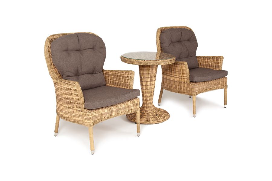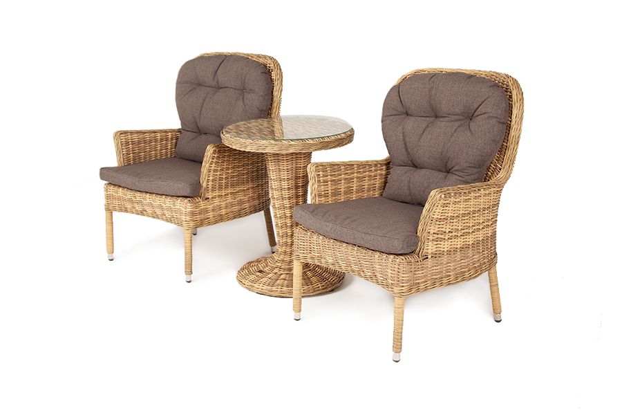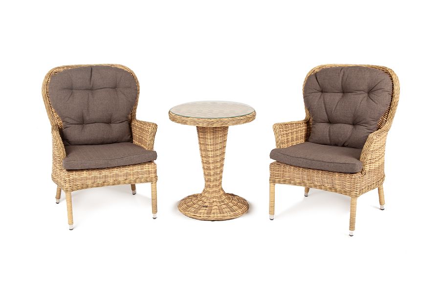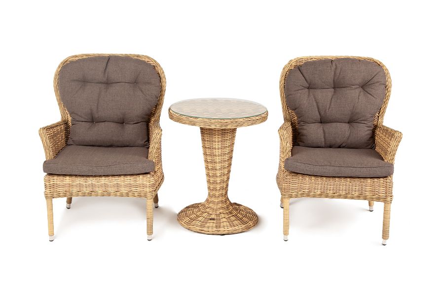 Алиса кофейный комплект из искусственного ротанга, цвет соломенный. Кофейный комплект «Алиса рассчитан на 2 персоны и подходит для расположения на балконе, в небольших гостиных, на террасе и других местах с ограниченным пространством. В основе каркас из алюминия. В состав входят: – круглый стол 600x600x750 мм #40;толщина стеклянной столешницы в 0,5 см #41; – 2 кресла - 720x760x1000 мм Плетение выполнено вручную искусственным ротангом соломенного цвета, кресло укомплектовано подушками из 100 #37; полиэстера, которые пропитаны специальным составом, обладающим влагоотталкивающим свойством. Габариты товара (ДШВ) 2040x760x1000мм Габариты упаковки (ДШВ) 204/100/76 Материал плетения искусственный ротанг Цвет плетения соломенный Вид ротанга круглый Материал каркаса (стул/кресло/диван) алюминий Материал подушки полиэстер 100% плотностью 230гр/м2 с влагоотталкивающей пропиткой Цвет подушки серо-коричневый Вес (Брутто) 42 Вес (Нетто) 32кг
