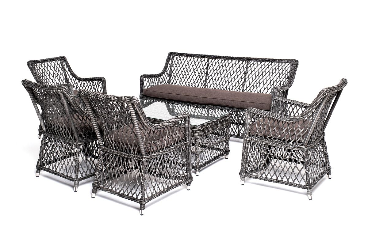 Асти лаунж-зона из искусственного ротанга на 6 персоны, цвет графит. Лаунж зона «Асти» подходит для размещения 6 персон. За прочность конструкции отвечает каркас из алюминия. В состав входят: – журнальный столик - 1100x570x460 мм #40;толщина стеклянной столешницы в 0,5 см #41; – двухместный диван - 1600x680x840 мм – кресло #40;4 шт #41; - 680х550х840 мм Оплетка выполнена вручную искусственным ротангом в цвете графит, диван и кресло укомплектованы подушками из 100 #37; полиэстера, которые пропитаны специальным составом, обладающим влагоотталкивающим свойством. Габариты товара (ДШВ) 2700x1800x840мм Габариты упаковки (ДШВ) 270/84/180 Материал плетения искусственный ротанг Цвет плетения графит Вид ротанга круглый Материал каркаса (стул/кресло/диван) алюминий Материал подушки полиэстер 100% плотностью 230гр/м2 с влагоотталкивающей пропиткой Цвет подушки серо-коричневый Вес (Брутто) 40 Вес (Нетто) 58.5кг