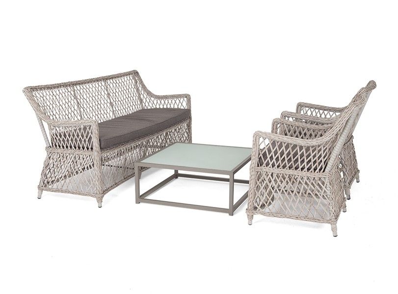 Асти-касабланка лаунж-зона из искусственного ротанга на 4 персоны, цвет бежевый. Лаунж зона «Асти-Касабланка » подходит для размещения четырех персон. За прочность конструкции отвечает каркас из алюминия. В состав входят: – журнальный столик - 750x750x320мм – двухместный диван - 1600x680x840 мм – кресло #40;2 шт #41; - 680х550х840 мм Оплетка выполнена вручную искусственным ротангом бежевого цвета, диван и кресло укомплектованы подушками из 100 #37; полиэстера, которые пропитаны специальным составом, обладающим влагоотталкивающим свойством. Материал плетения искусственный ротанг Материал столешницы закаленное стекло Цвет плетения бежевый Вид ротанга круглый Материал каркаса (стул/кресло/диван) алюминий Материал подушки полиэстер 100% плотностью 230гр/м2 с влагоотталкивающей пропиткой Цвет подушки серо-коричневый Вес (Брутто) 40 Вес (Нетто) 59кг