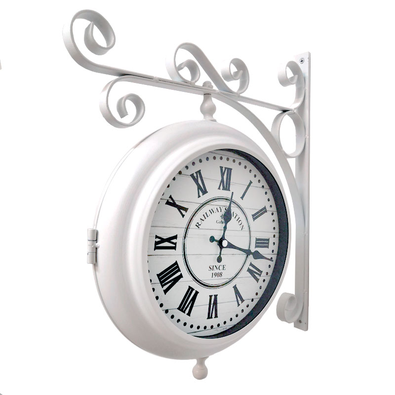 Настенные двусторонние часы на кронштейне GALAXY AYP-820 White белого цвета имеют надежный бесшумный кварцевый механизм, работающий от батарейки типа АА (пальчиковые). Эта модель идеально подойдет для дома в гостиную комнату разных стилей, включая восточный и под старину. Временные рамки обозначены арабскими цифрами с одной стороны и римскими с другой стороны. Фактически это двое часов, скрепленные вместе. Стрелки под стеклом.