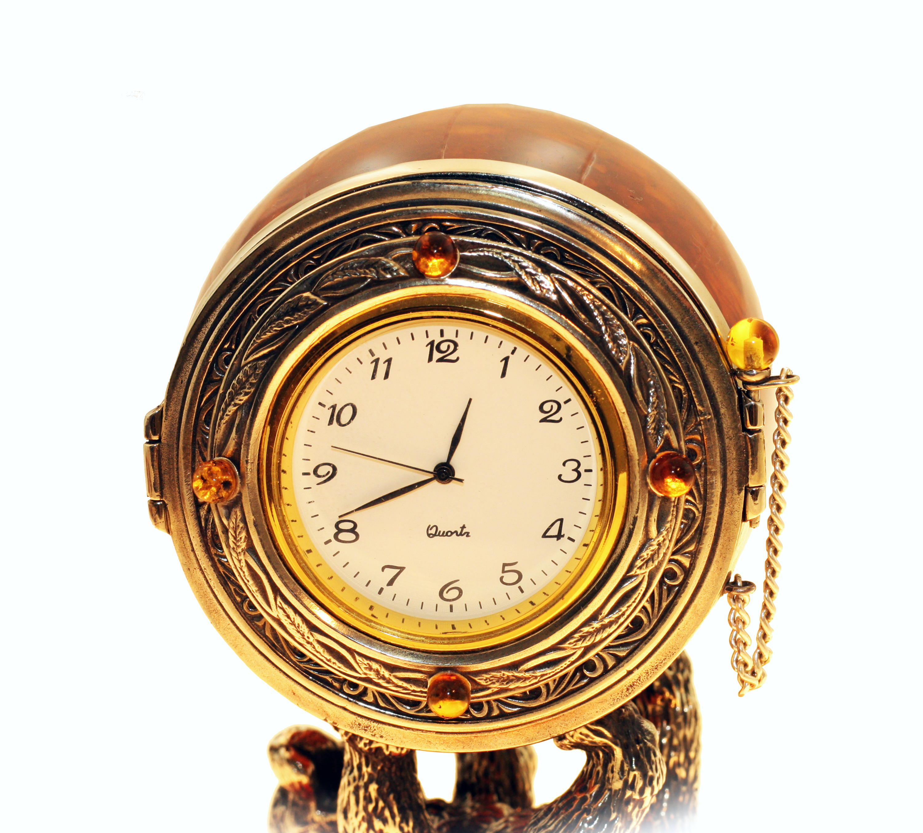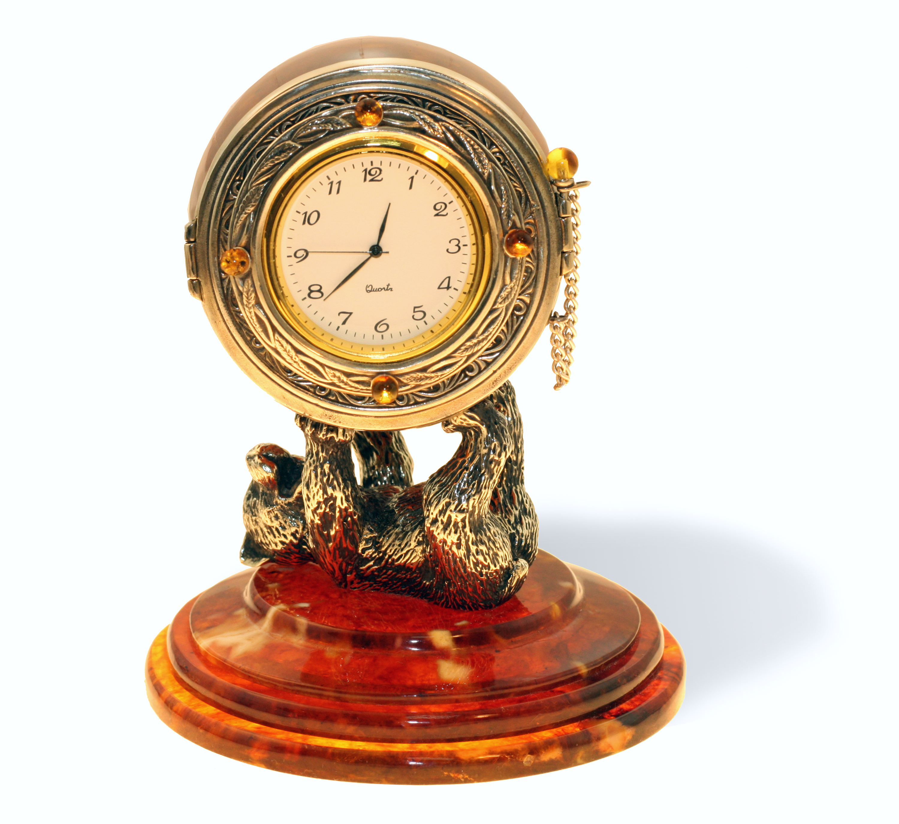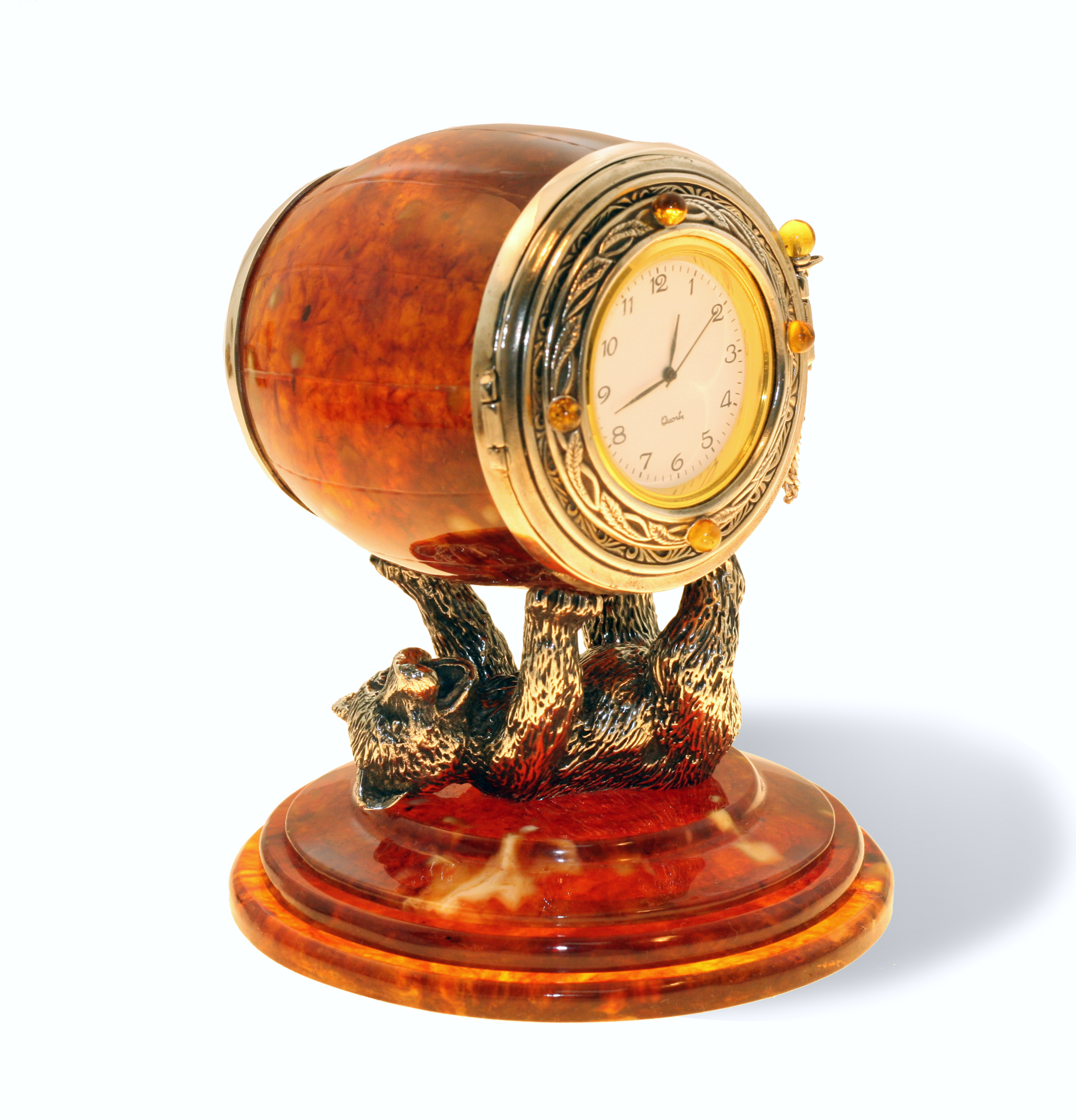 Сувенир-часы "цирковой медведь" из янтаря. Состав: натуральный янтарь, серебро 875 пробы / белая ювелирная бронза, часы кварцевые. Вес серебра в изделии - 250 гр. Поставляется в подарочном футляре. В случае отсутствия товара на складе срок изготовления от трех недель.