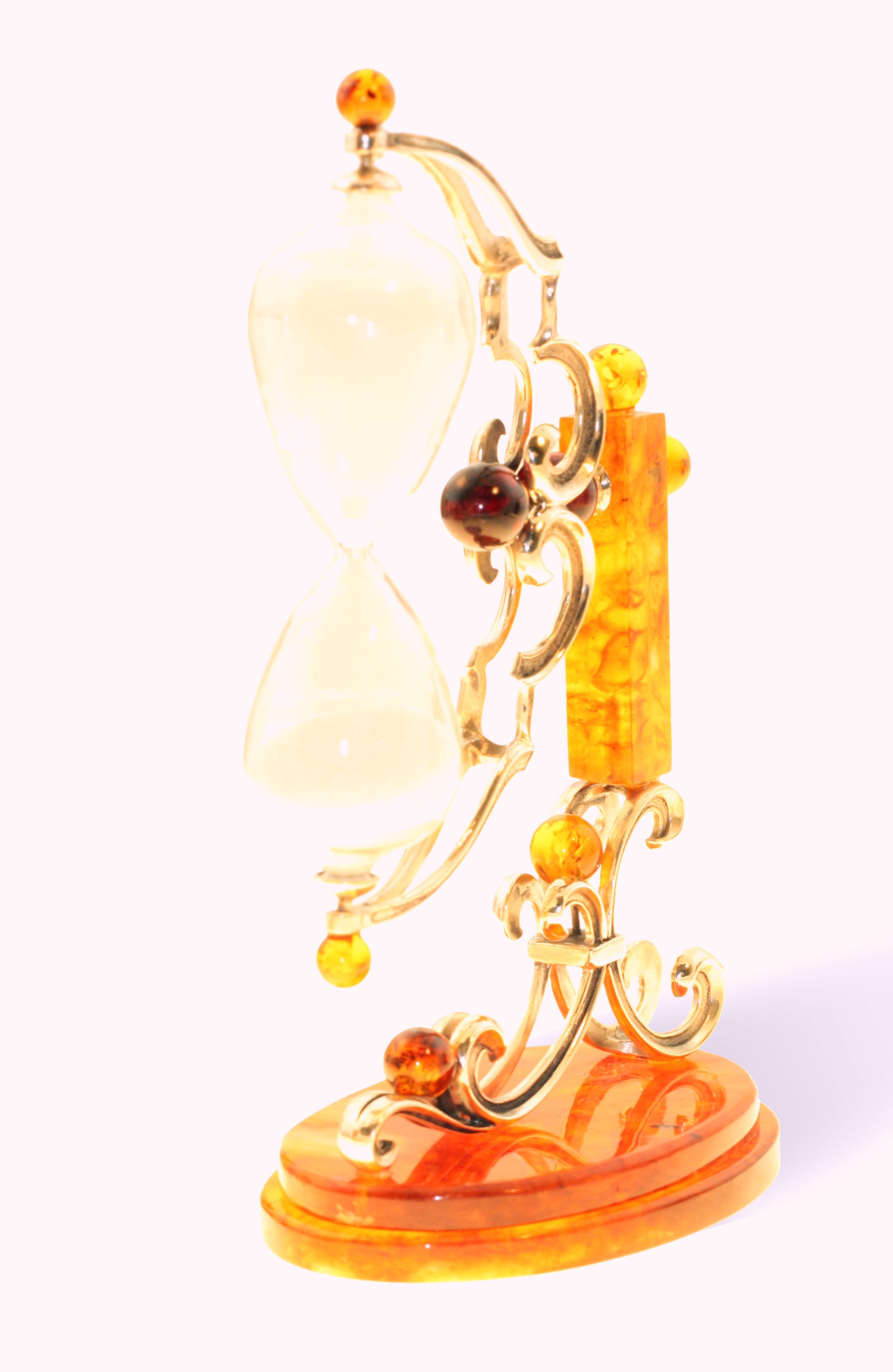 Песочные часы из янтаря. Состав: янтарь, стеклянная колба с кварцевым песком, серебро 875 пробы или белая ювелирная бронза. Вес серебра в изделии - 50 гр. Высота - 14 см. Поставляется в подарочном футляре. В случае отсутствия товара на складе срок изготовления от трех недель.