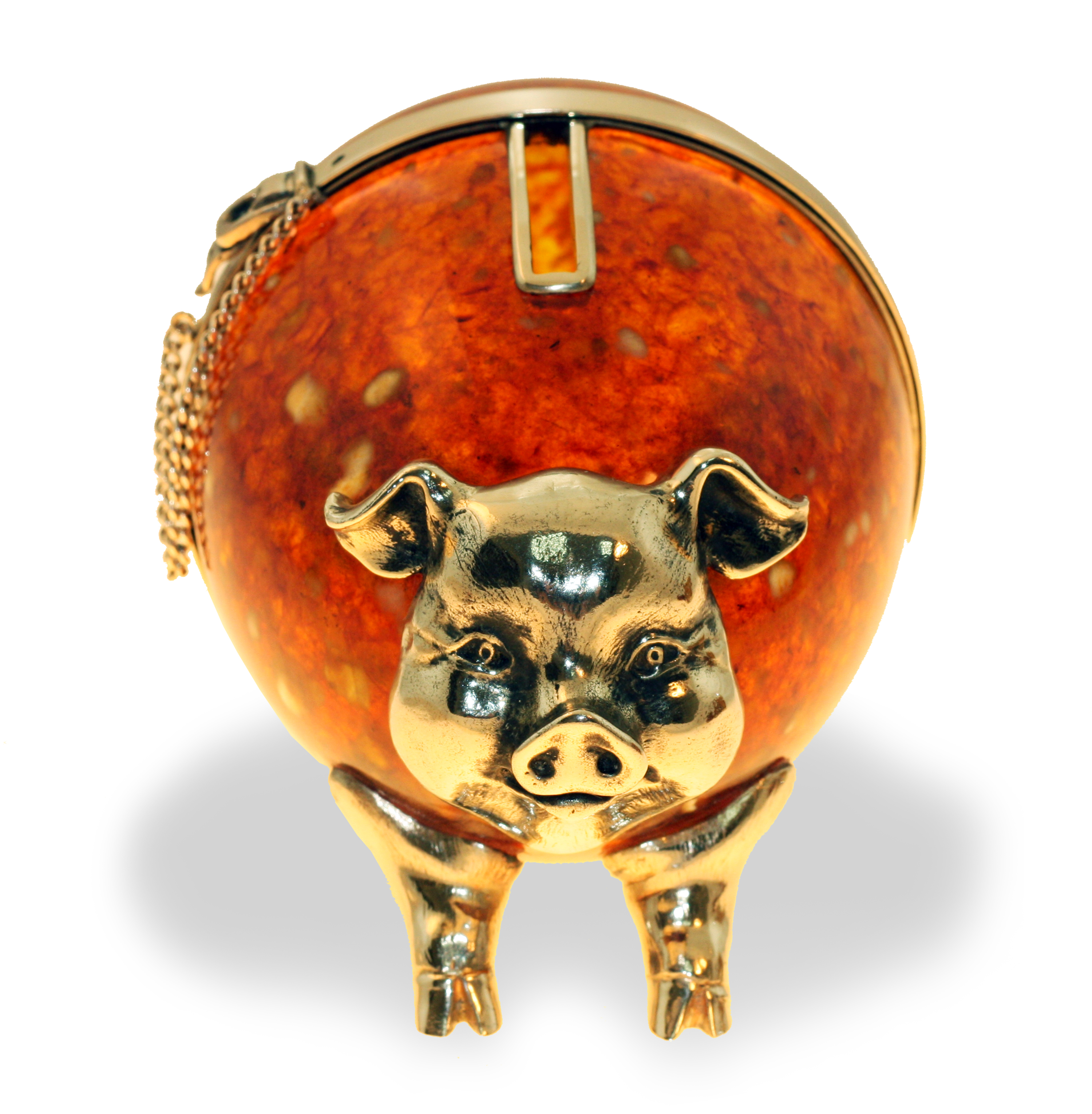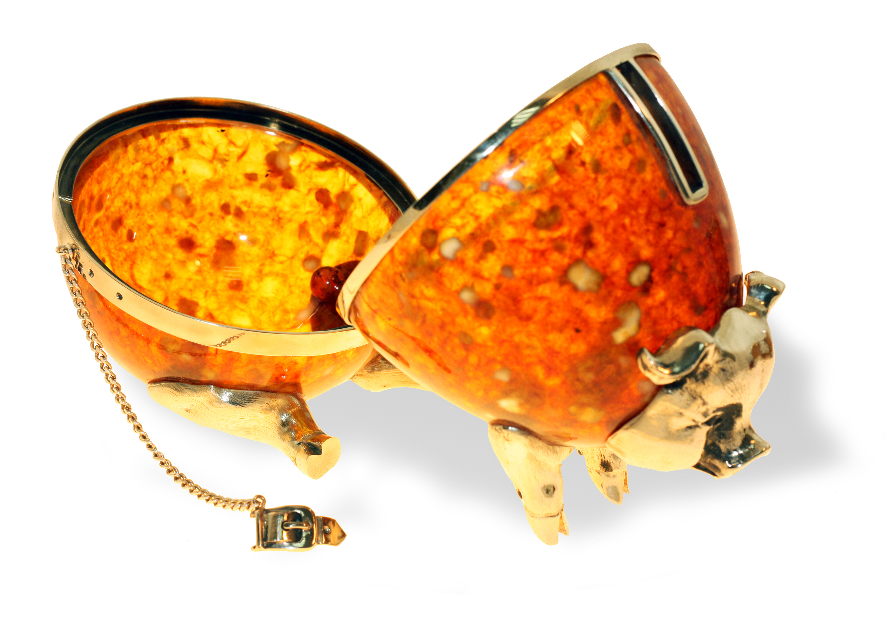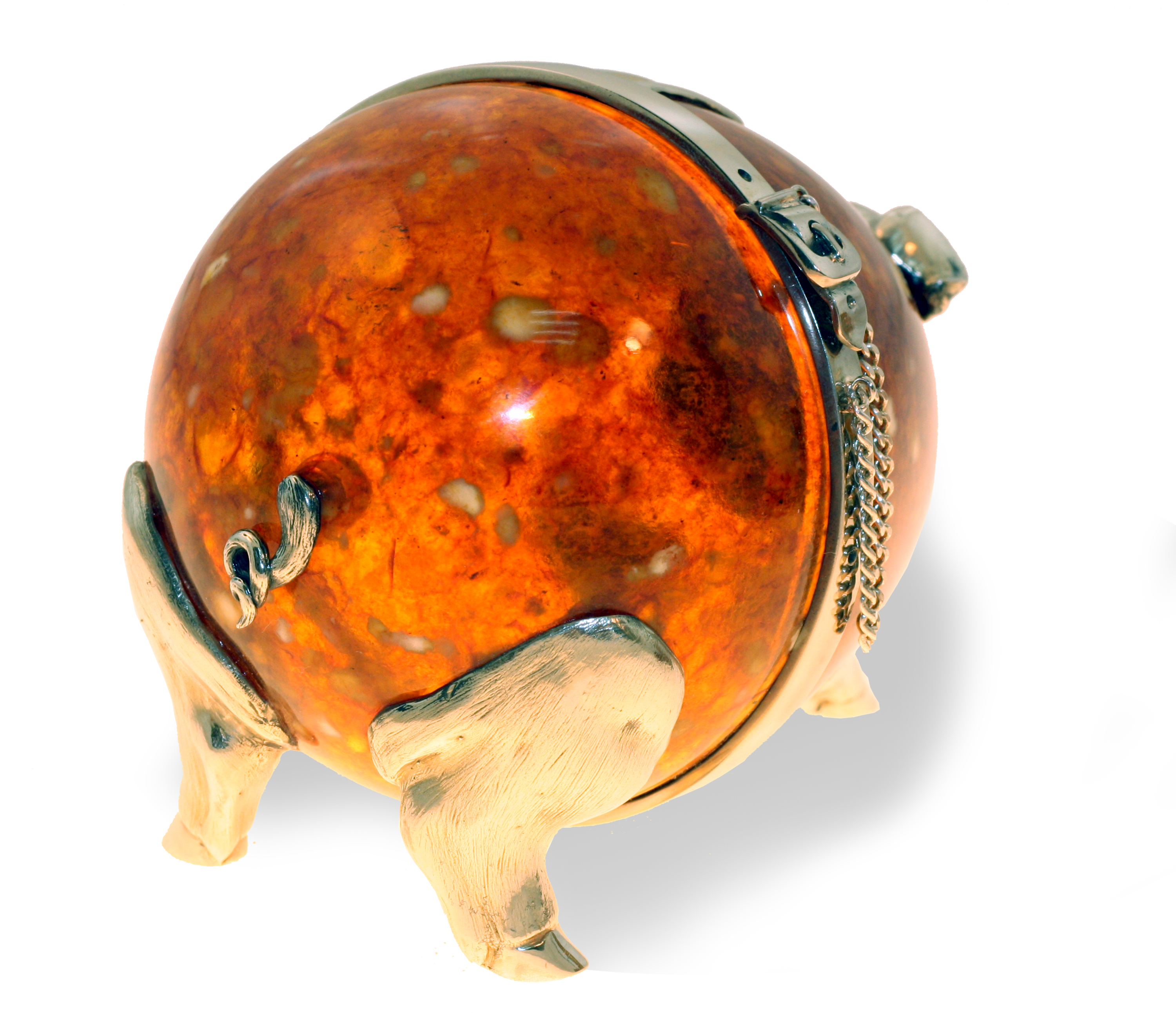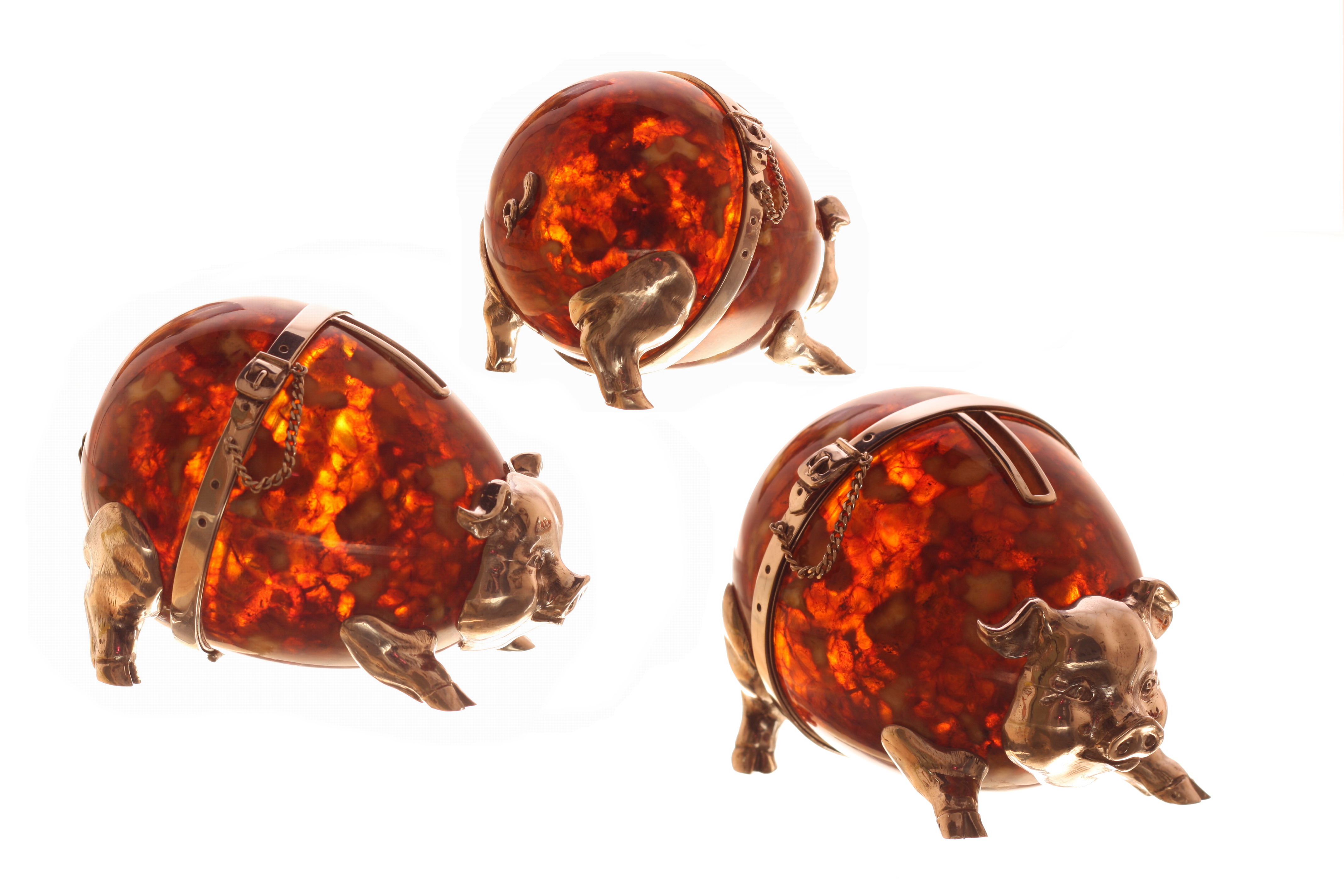 Сувенир "свинья-копилка" из янтаря. Состав: натуральный янтарь, серебро 875 пробы / белая ювелирная бронза. Вес серебра в изделии - 199,37 гр. Размер: длина - 12 см, диаметр - 8 см. Поставляется в подарочном футляре. В случае отсутствия товара на складе, срок доставки - от 3 недель.