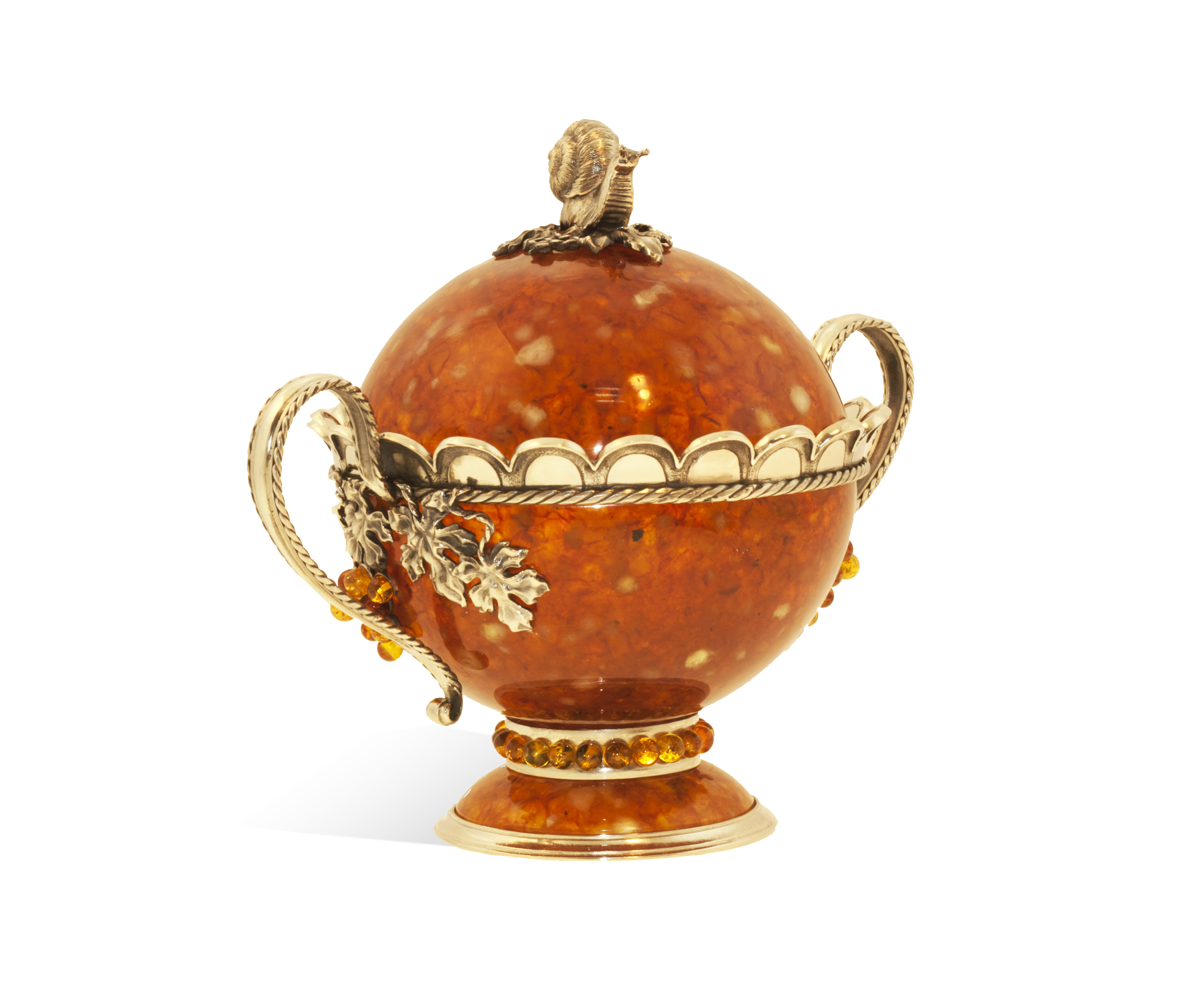 Бонбоньерка (сахарница) "виноград" из янтаря. Высота: 17,0 см, диаметр: 13,0 см (с ручками 20,5 см) Состав: натуральный янтарь,белая ювелирная бронза или серебро 875 пробы. Вес серебра в изделии - 350 гр. Поставляется в подарочном футляре. В случае отсутствия товара на складе срок изготовления от трех недель.