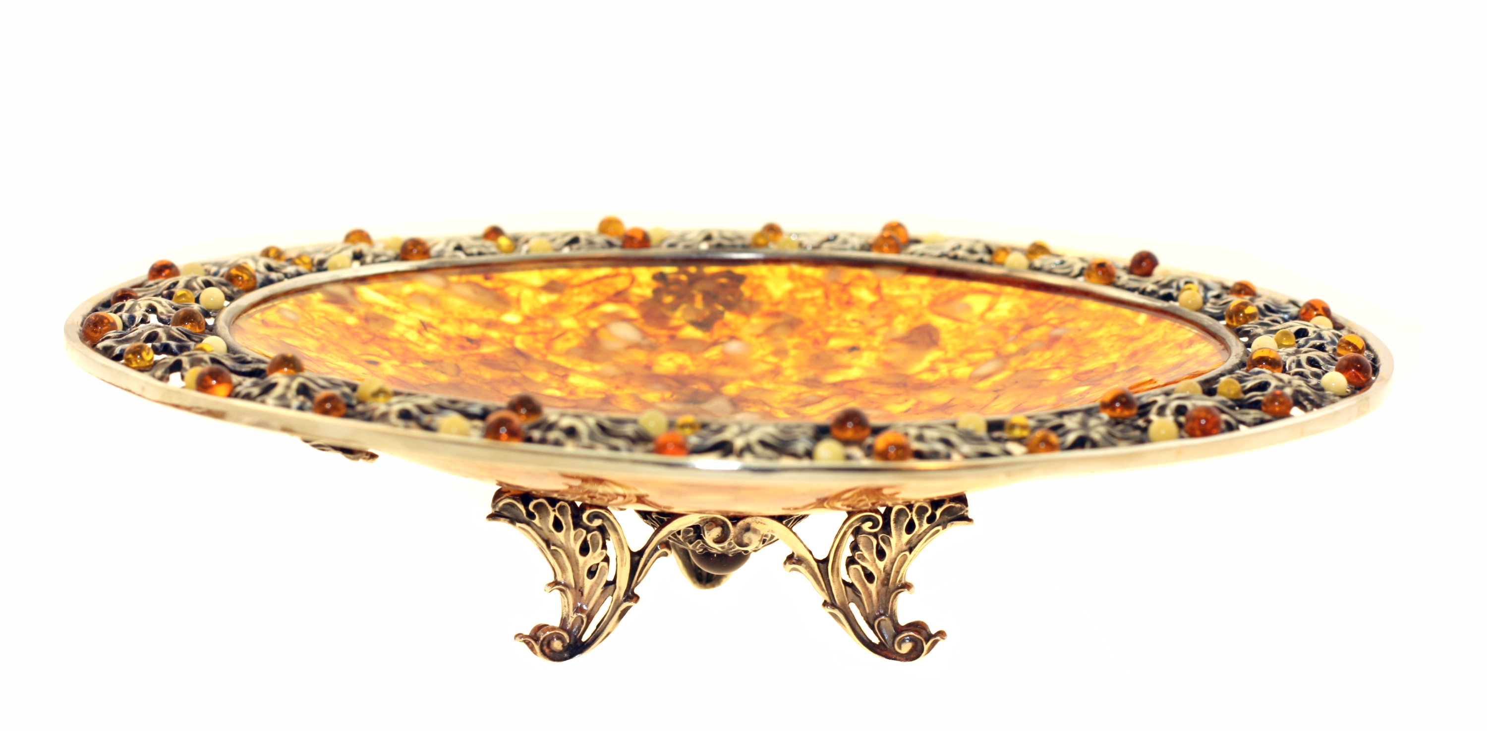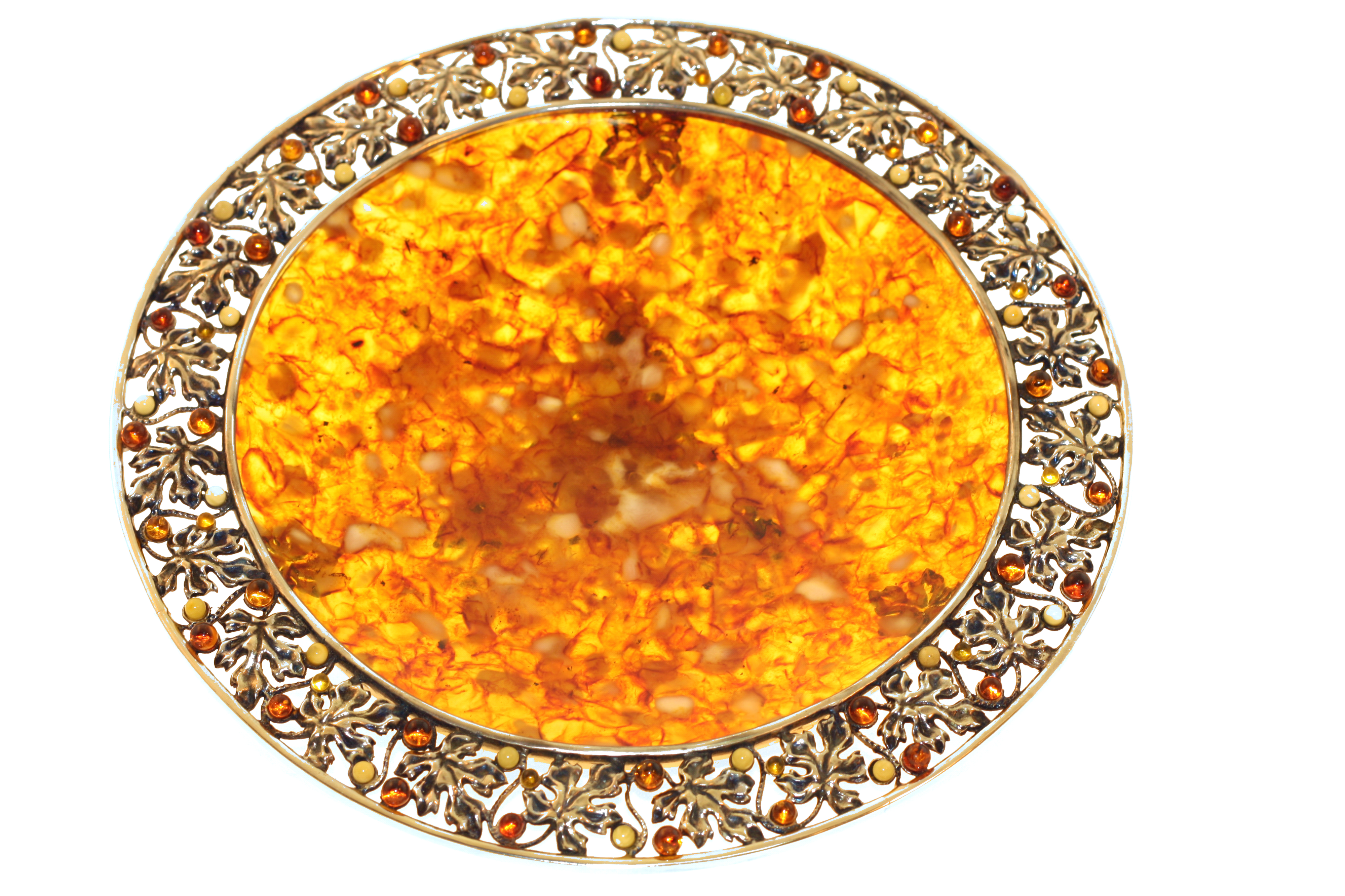Блюдо "виноградное" из янтаря. Высота: 5 см; диаметр: 21 см. Состав: натуральный янтарь,белая ювелирная бронза или серебро 875 пробы. Вес серебра в изделии - 265 гр. Поставляется в подарочном футляре. В случае отсутствия товара на складе срок изготовления от трех недель.