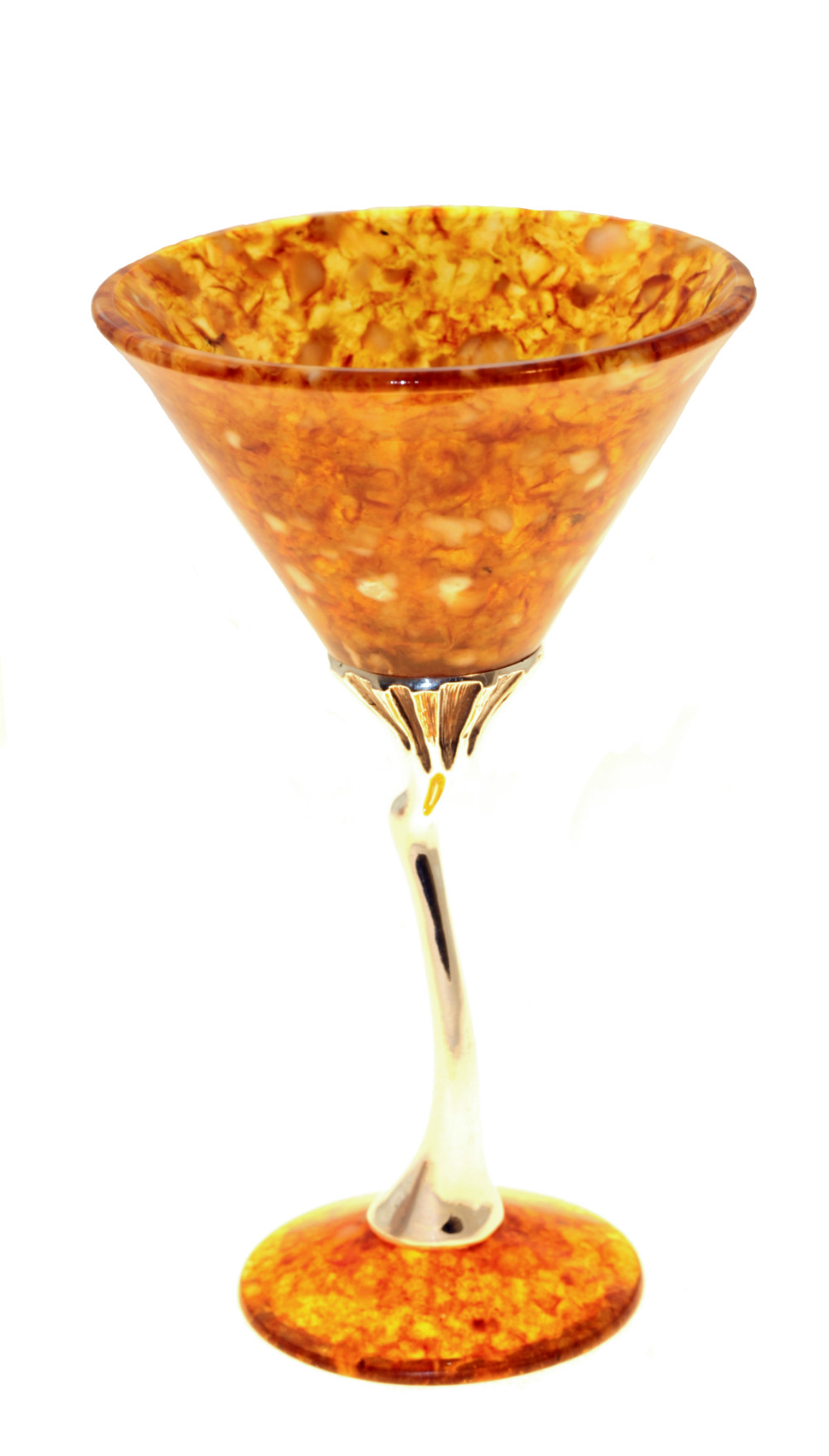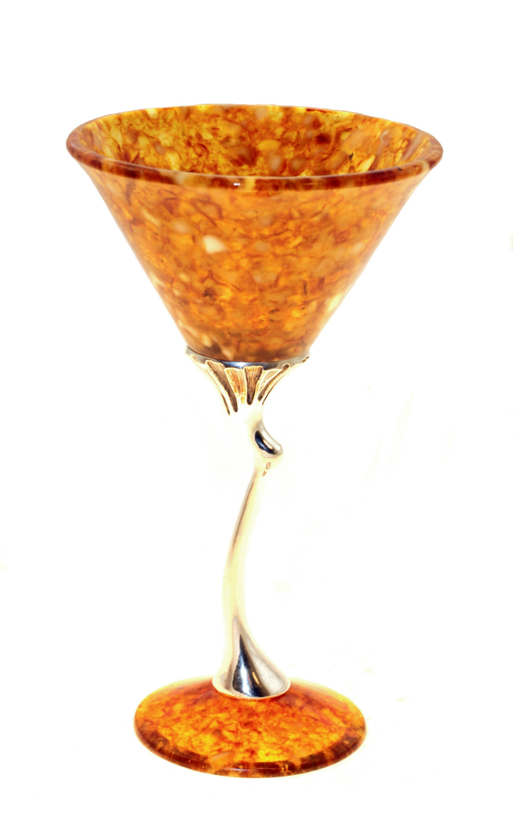 Бокал для мартини "лето" из янтаря (на 2 персоны). Высота: 14,5 см; диаметр емкости: 8,5 см. Объем: 100 мл. Состав: натуральный янтарь, белая ювелирная бронза или серебро 875 пробы. Вес серебра в изделии - 63,5 гр. Поставляется в подарочном футляре. В случае отсутствия товара на складе срок изготовления от трех недель.