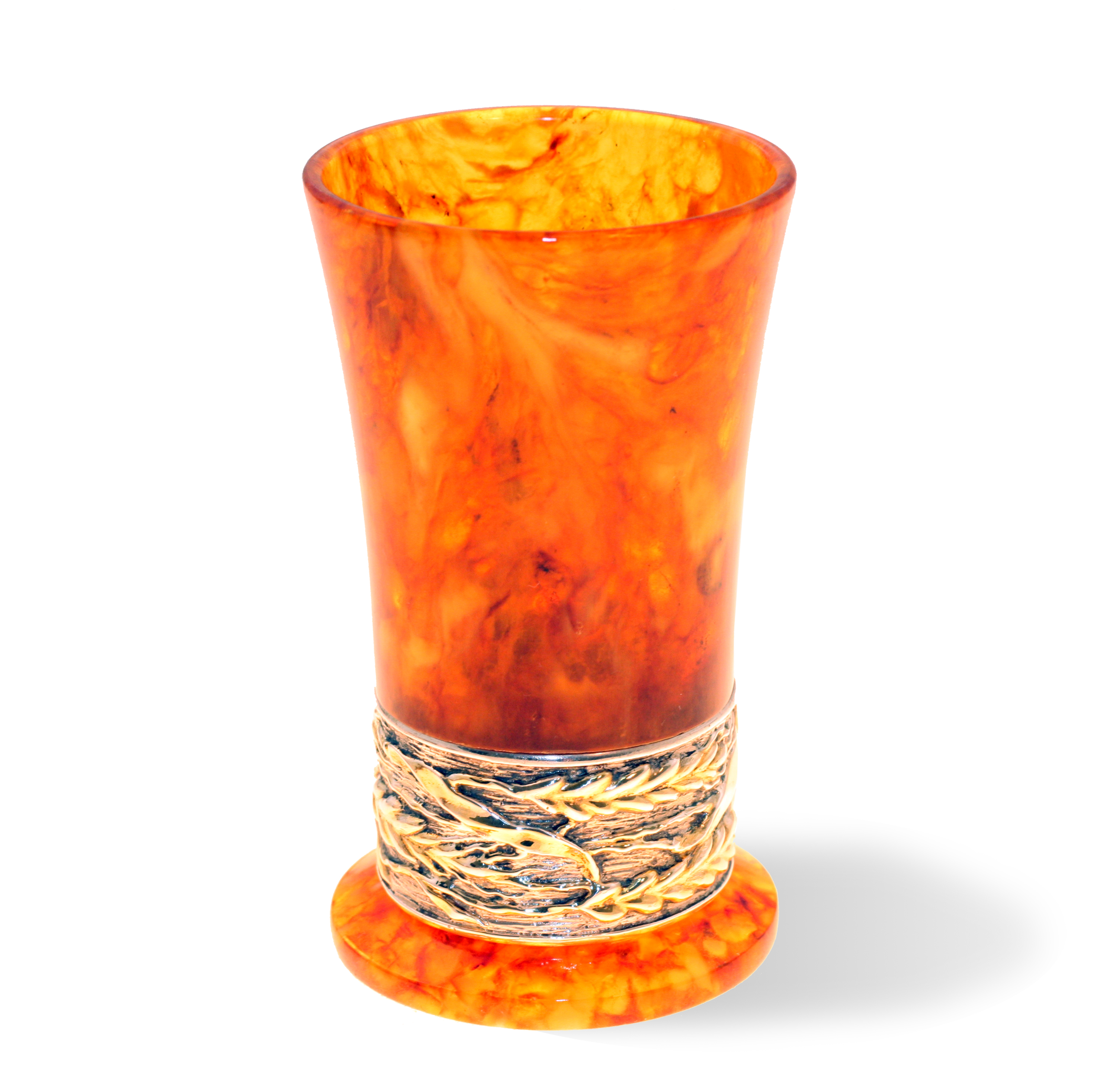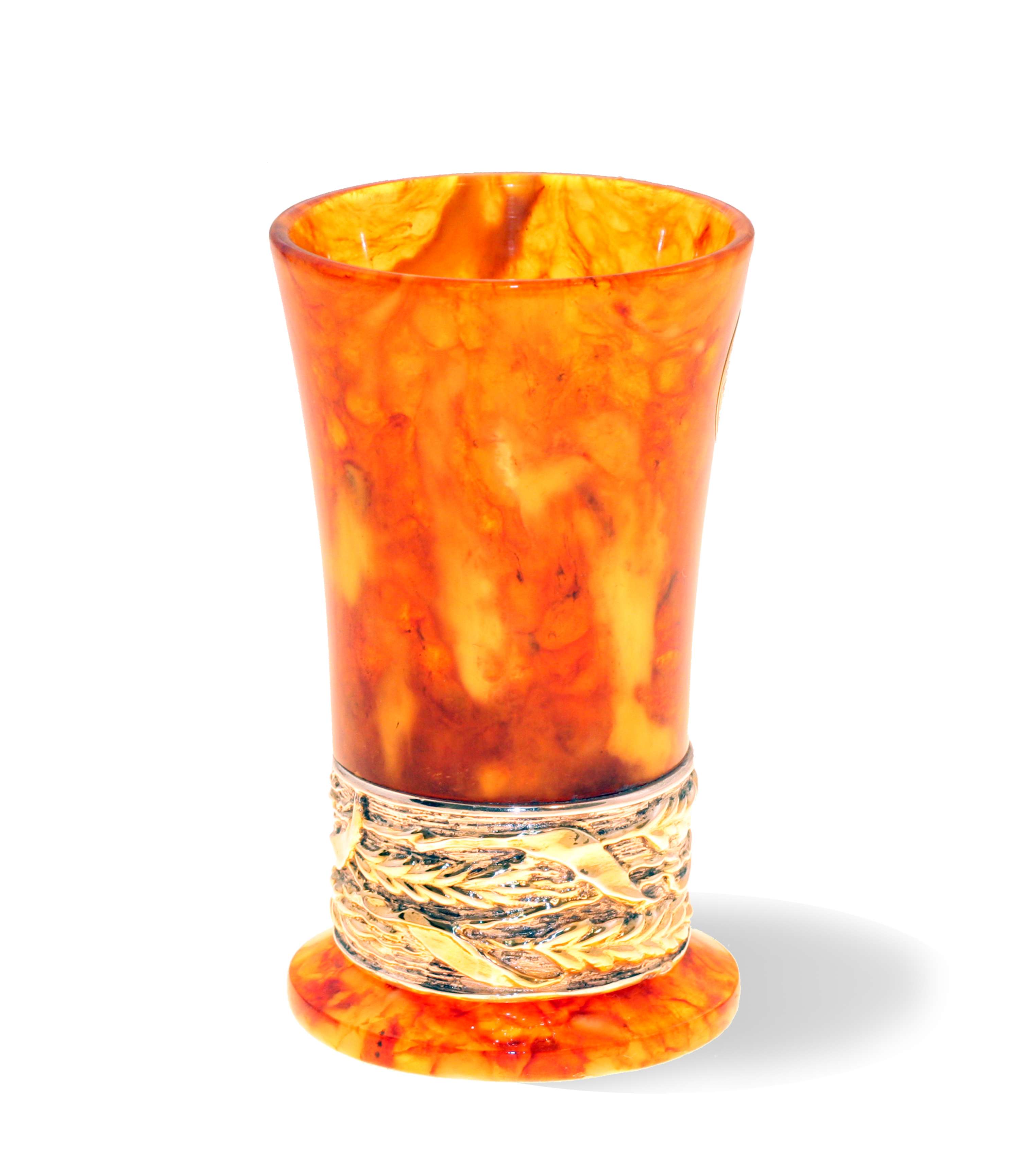 Стопка "пшеничная" из янтаря. Высота: 8,0-8,5 см, диаметр: 5,0 см Объем: 50 мл Состав: натуральный янтарь,белая ювелирная бронза или серебро 875 пробы, позолота. Вес серебра в изделии - 30 гр. Поставляется в подарочном футляре. В случае отсутствия товара на складе срок изготовления от трех недель.