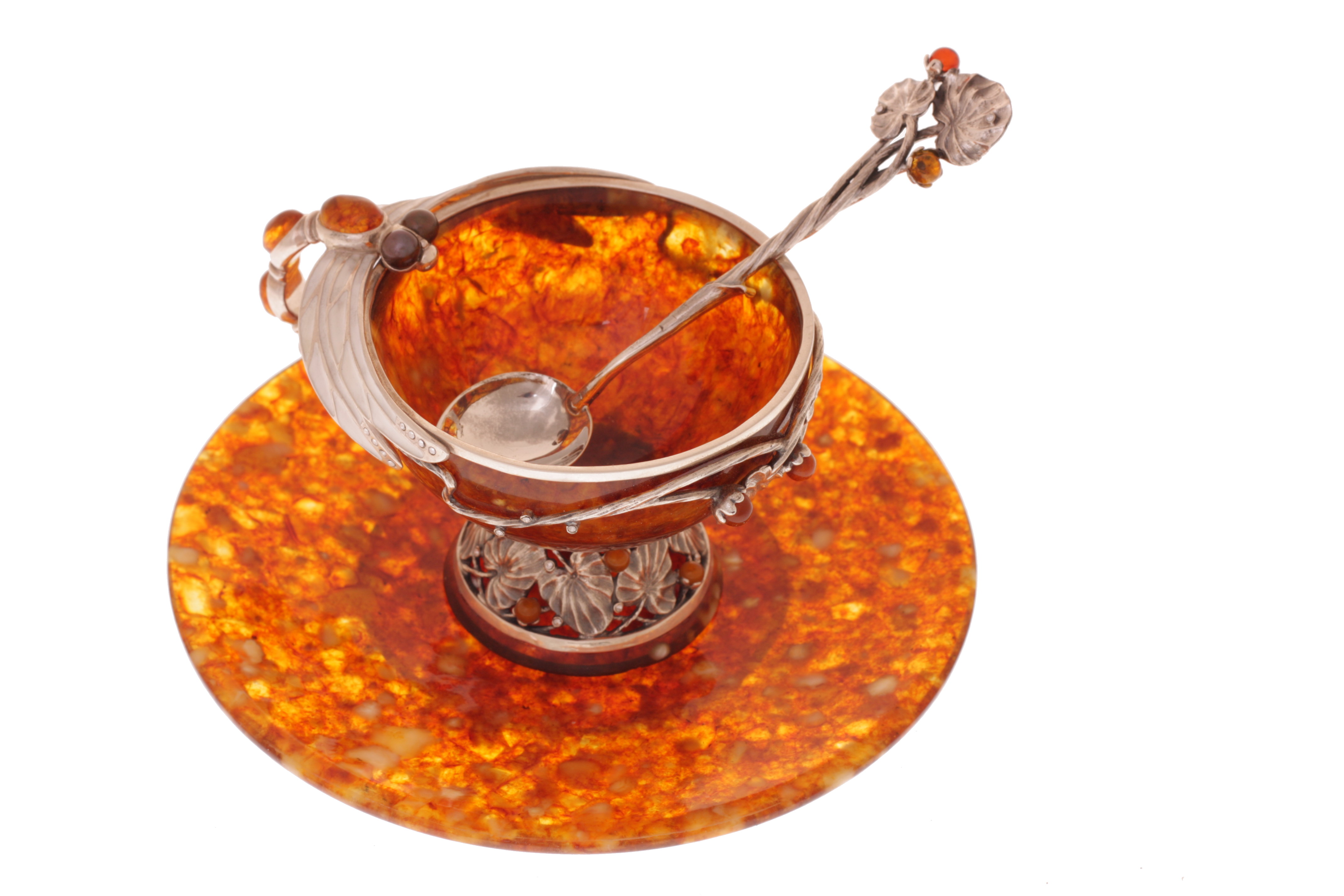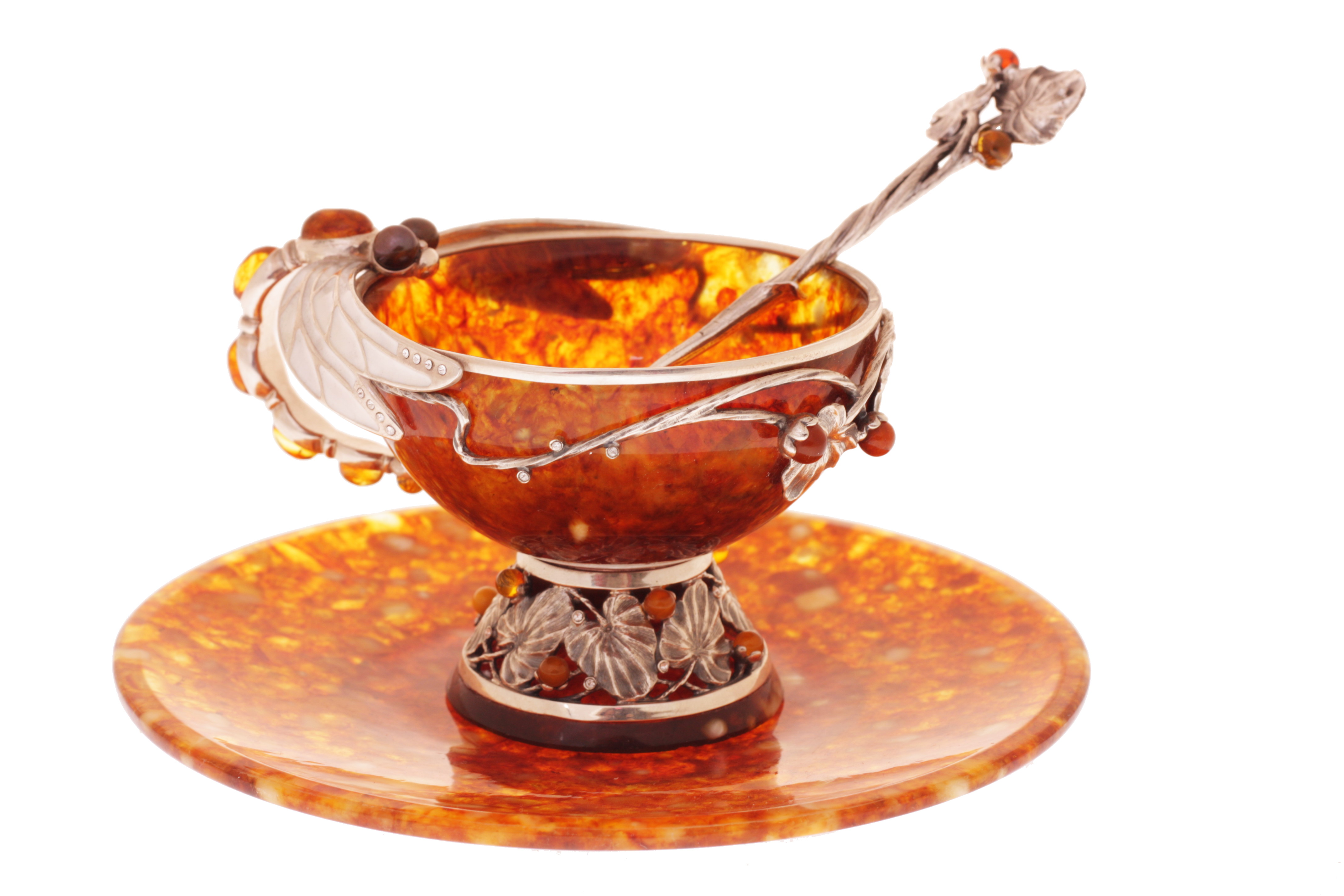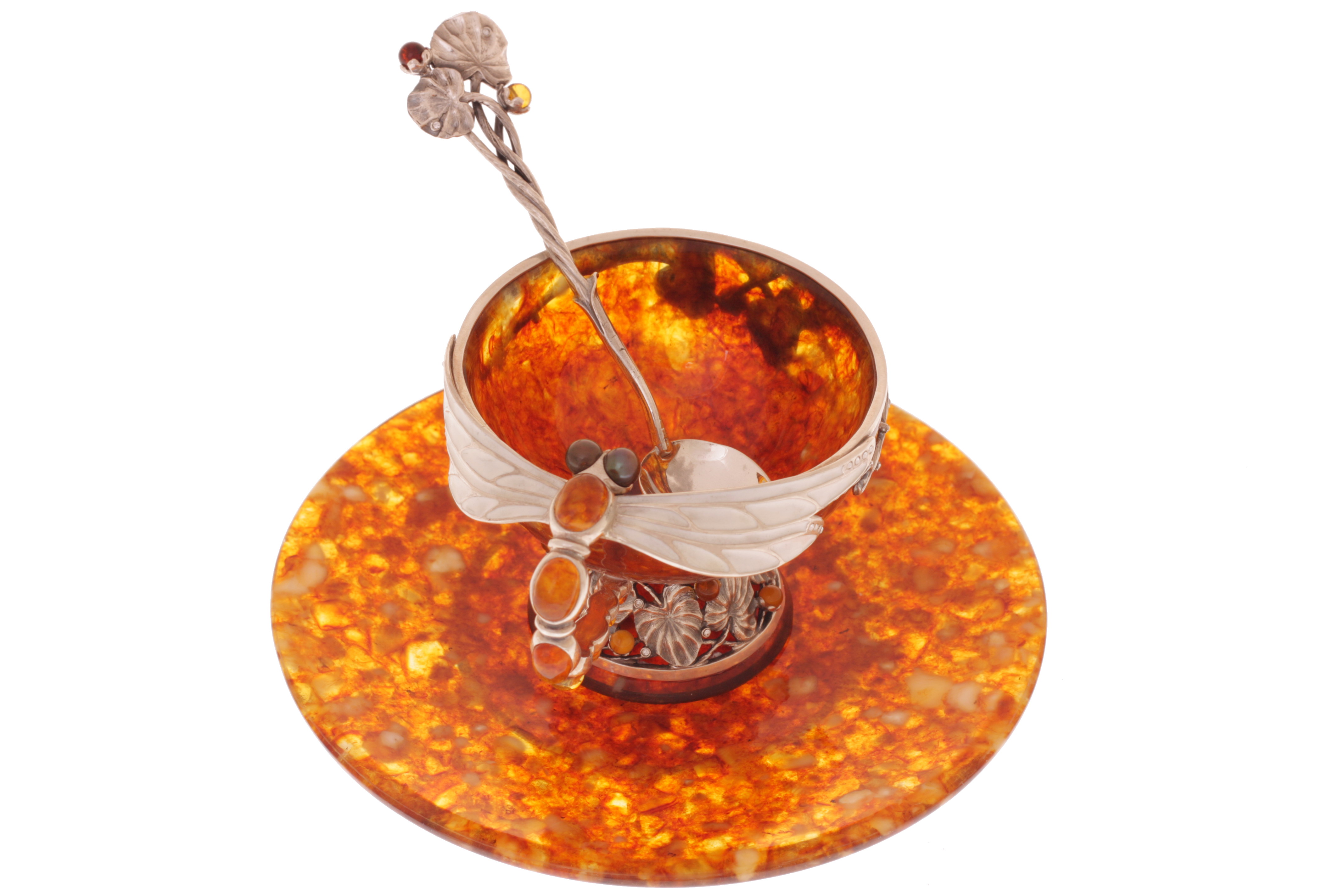 Янтарная чайная чашка Ирис 4402/L (серебро) Кофейная чашка "Стрекоза" из янтаря с ложечкой