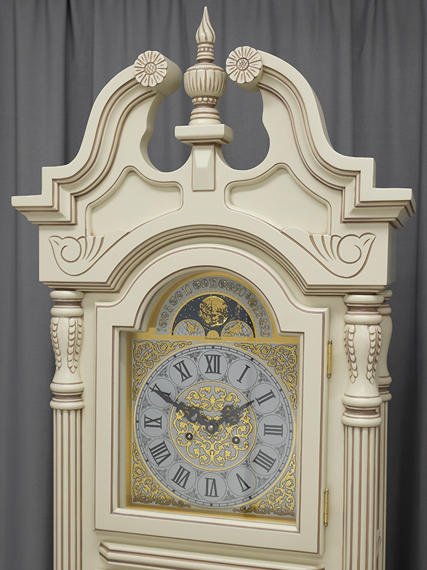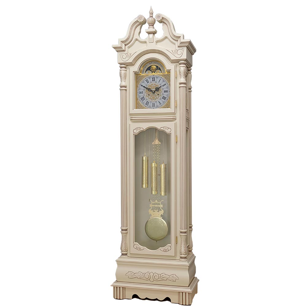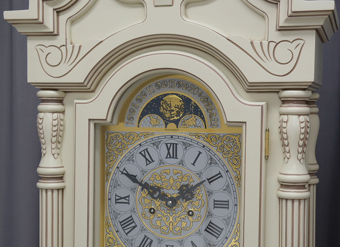 Механические напольные часы cr-9221-pd-ivory. Механические напольные часы Columbus CR-9221-PD-Ivory «Белый лебедь» Механические напольные часы Columbus CR-9221-PD-Ivory в цвете Слоновая кость с золотой Патиной имеют надежный механизм. Элементы фасада корпуса изготовлены из отборных пород твердого дерева. Маятник и гири золотистого цвета. Корпус тонирован в теплый цвет слоновой кости с золотым патинированием, который позволит этим часам стать неотъемлемой частью интерьеров, решенных в различных стилях и цветовых гаммах. На золоченый циферблат из полированной латуни нанесены римские цифры. На центральном диске взгляд приковывает ажурный высеченный узор из латуни. Гири и маятник золотого цвета. Циферблат с имитацией лунного календаря. Описание напольных часов Columbus CR-9221-PD-Ivory: Элементы фасада корпуса изготовлены из отборных пород твердого дерева; - Тонирование корпуса выполнено в цвете - слоновая кость с золотой патиной. -Сам корпус украшен арочным фронтоном, с накладными резными элементами, мотивами резьбы, перекликаясь с узорами нижней тумбы; - Верхняя люцерна и нижняя дверца часов, обрамлены каннелированными колоннами с изящными капителиями; - Центральный диск циферблата украшен высеченным, тончайшим узором из латуни - Циферблат из полированной латуни с классическими римскими цифрами, расположенными по окружности покрытой белой эмалью, с надсводными декоративными уголками; - Имитация лунного календаря; - Механизм пружинный с ручным заводом, бой на каждые полчаса и час, ручное отключение боя. - Вес-29 кг. Размер: 208x58x28 см