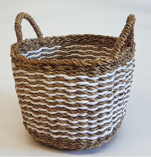 Наименование: Корзина плетеная №4 Артикул: CV-21342 S/4 Цвет: натуральный и белый Размер: диаметр: 19 см, высота: 20/28 см Состав: морская трава