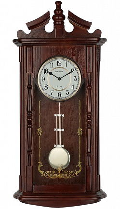 Настенные часы co-00390. Мелодия : 4 типа - Westminster и часовой бой (в разных сочетаниях). Программное отключение звука с 22.00 до 5.00 часов Материал корпуса натуральное дерево с резным фронтоном Механизм кварцевый Размер часов 70х33х11 см Питание 4 элемента типа АА (R6)