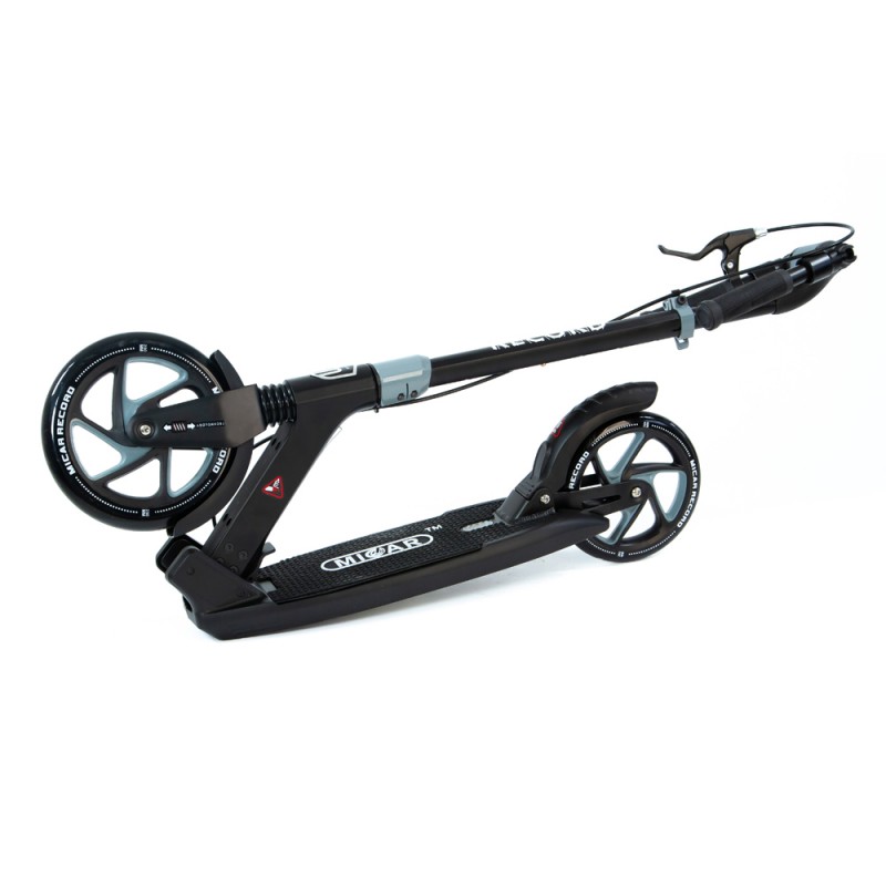 Двухколёсный самокат micar record 230 чёрно-серый. Амортизатор передний и задний Вес самоката 6 кг Возрастная категория От 6-7 лет Гарантия производителя 1 год Дополнительные функции Складной самокат, передний и задний амортизаторы, ручной тормоз, специальный зажим для ручек на руле Максимальная нагрузка 100 кг Материал рамы Алюминий Подшипники АВЕС-9 Размер колёс переднее - 230 мм, заднее - 200 мм Размер платформы 33 х 16 см Регулируемая высота руля 90-106 см Тормоз Ручной тормоз заднего колеса, ножной тормоз