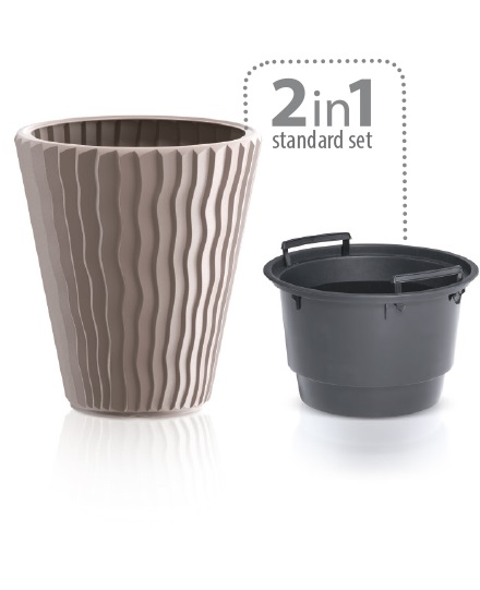 Кашпо для цветов sandy dbsp400-405u серый 2 предмета 18 и 37л. Кашпо для цветов SANDY 405U является замечательным украшением вашего садового интерьера, дома, зоны отдыха. Кашпо обладает повышенной стойкостью к высоким и низким температурам, а также к различным механическим повреждениям. Кашпо для цветов SANDY 405U состоит из двух предметов: внутренней емкости, куда сажают растение, и декоративной емкости. • Комплектация: 2 предмета (внутренняя емкость + декоративная емкость) • Размер (диаметр х высота): 390х436 мм • Объемы: 18 л / 37 л • Цвет: серый • Материал: пластик • Вес брутто: 1,17 кг (0,75 кг + 0,42 кг) • Транспортная упаковка: 5 штук • Производство: Prosperplast • Страна: Польша
