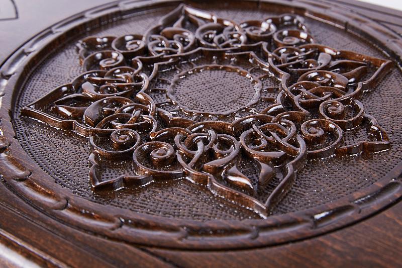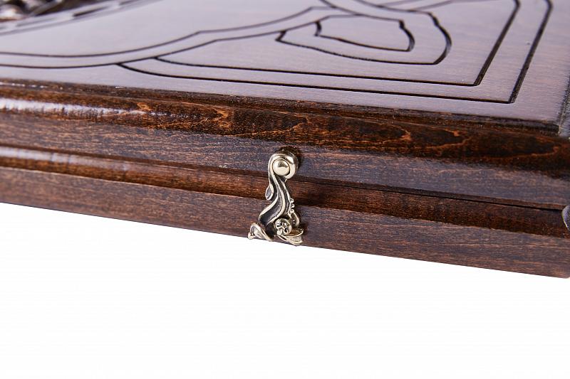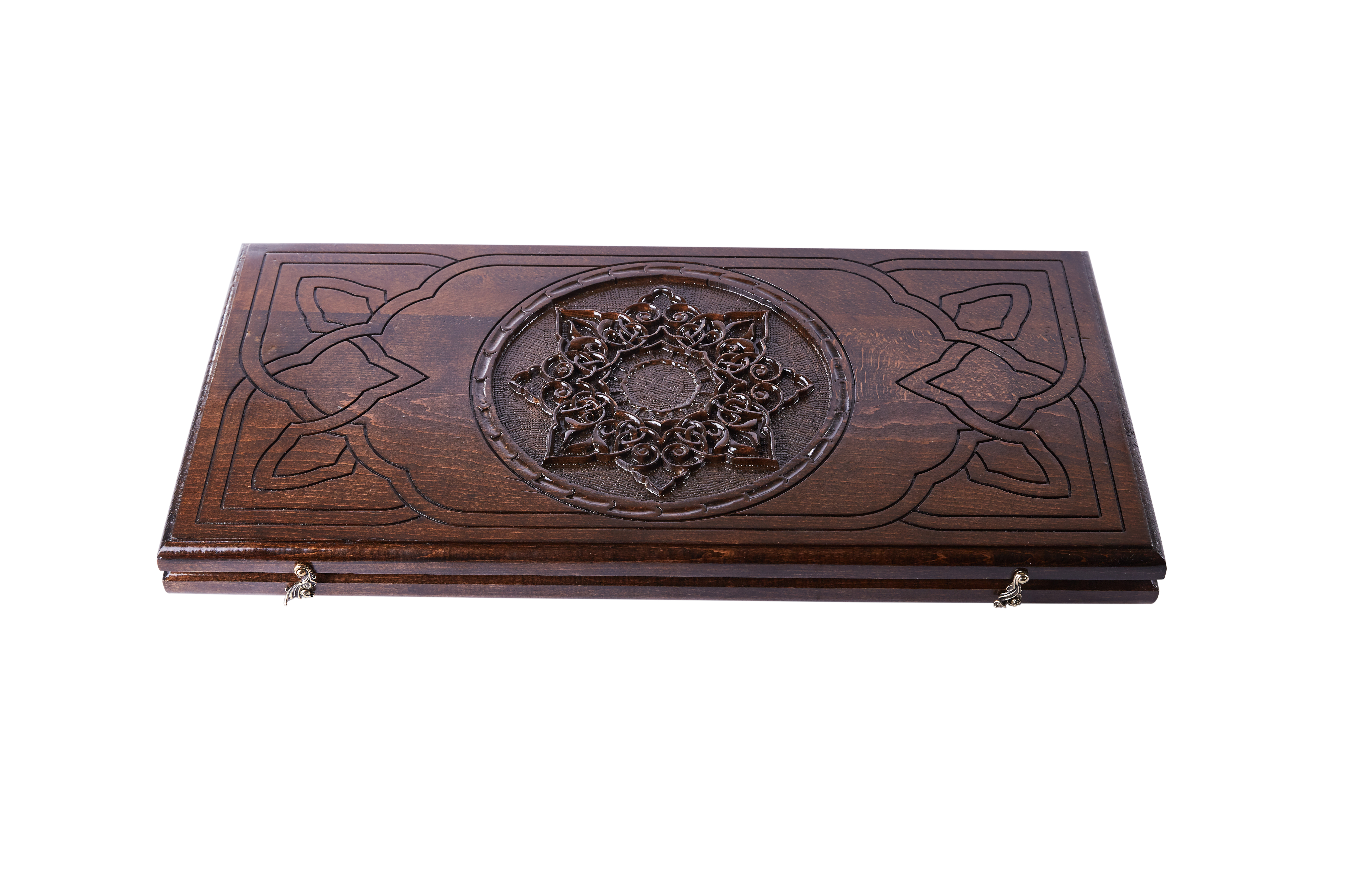 Нарды резные сияние 1, mkhitaryan. Если за дело берётся настоящий мастер, то получается красивое, долговечное и стильное изделие - нарды резные «Сияние 1». Благодаря богатому опыту и чувству вкуса армянского изготовителя Давида Мхитаряна, каждый может купить себе игровую поверхность с уникальным оформлением, выполненную из проверенных материалов. Здесь применяется бук, известный тем, что на протяжении долгого времени сохраняет привлекательность, выдерживает попадание влаги и не рассыхается. Узор в центральной части выполнен методом ручной резьбы, что придаёт доске собственный шарм и индивидуальность. На второй створке в центре разлиновано поле для шашек и шахмат, также с интересными элементами оформления. Открывая створки, сразу в глаза бросаются белые узоры на ячейках и в центре, а также бронзовые петли необычной формы с рифлением. По бокам расположили вырезы, предназначенные для фишек, и повышающие удобство во время игр.