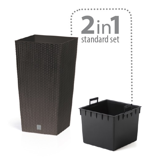 Кашпо для цветов rato square drts400-s433 антрацит 2 предмета 37 и 91,5л. Кашпо для цветов RATO SQUARE S433 является замечательным украшением вашего садового интерьера, дома, зоны отдыха. Кашпо выполнено с имитацией под натуральный ротанг, что делает его стильным элементом декора. Благодаря прочному пластику изделие устойчиво к ультрафиолетовым лучам. Кашпо для цветов RATO SQUARE S433 состоит из двух предметов: внутренней емкости, куда сажают растение, и декоративной емкости. • Комплектация: 2 предмета (внутренняя емкость + декоративная емкость) • Размер (ДхШхВ): 400х400х750 мм • Объемы: 37 л / 91,5 л • Цвет: антрацит • Материал: пластик + имитация ротанга • Вес брутто: 4,57 кг (3,26 кг + 1,31 кг) • Транспортная упаковка: 3 штуки • Производство: Prosperplast • Страна: Польша