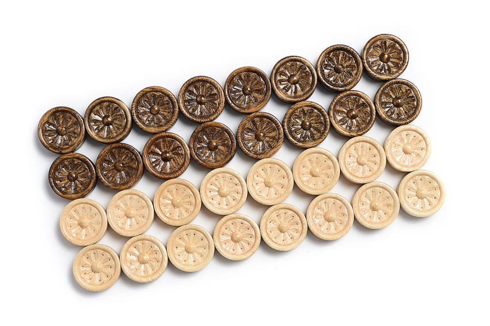 Фишки для нард и шашек ромашка , karen harutyunyan 29 мм. Материал Бук Артикул F001-01 Состояние Новое Упаковка Пакет Производитель Карен Арутюнян Страна Армения Количество фишек (шт) 16 светлых 16 темных Диаметр Фишки (см) 2,9 Размер в упаковке (см) 23/12/1 Фишки с подложкой Да Исполнение Резные