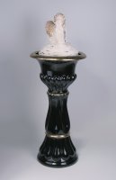 Напольный фонтан «в облаках». Большой напольный фонтан со скульптурной фигурой задумавшегося ангела, отдыхающего на облаке. Расположена на постаменте черного цвета. Выступающие части постамента, крылья и волосы ангела покрыты золотой поталью. Источник воды находится в завихрении облака у ног ангела. Вода с негромким журчанием стекает по поверхности облака в чашу. Размеры (ВхШхД): 114x42x42 см.