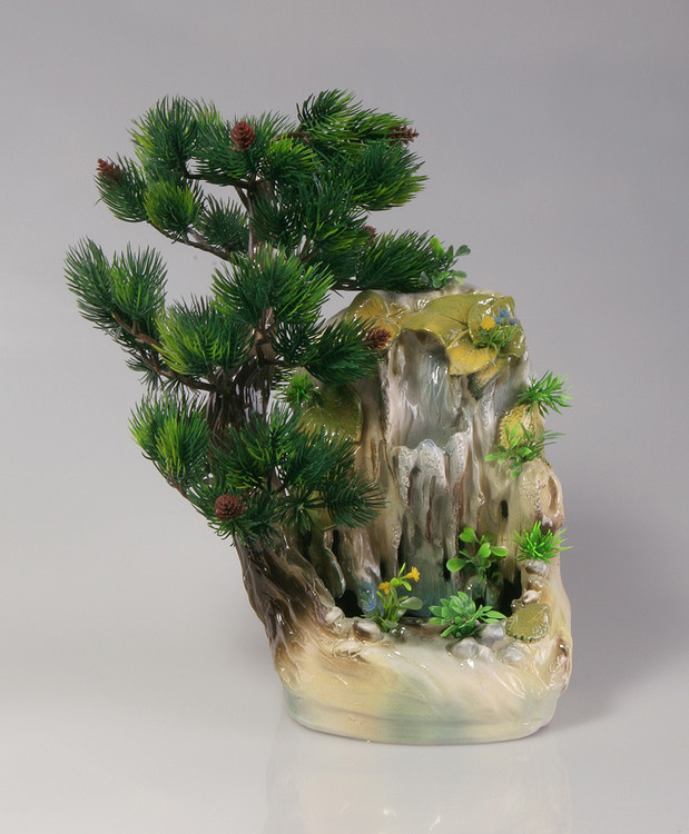 Настольный фонтан «карелия». Настольный фонтанчик с небольшим основанием высотой 38 см, обильно декорированный хвоей. Компактность фонтана достигается за счёт отсутствия резервуара с водой, как отдельного конструктивного элемента — вода собирается внутри самого фонтана. Вода стекает по скалам. Размеры (ВхШхД): 38x15x17 см.
